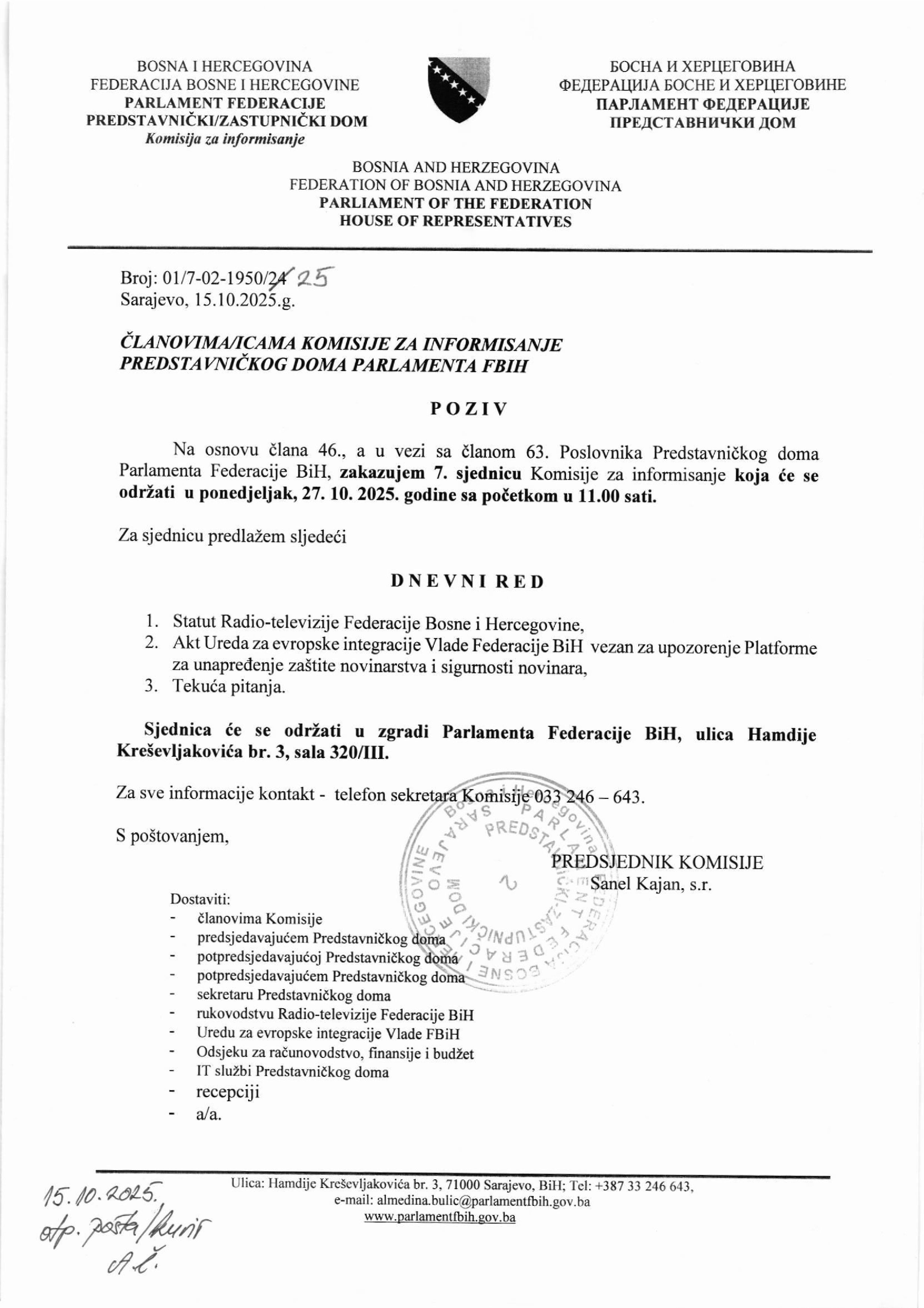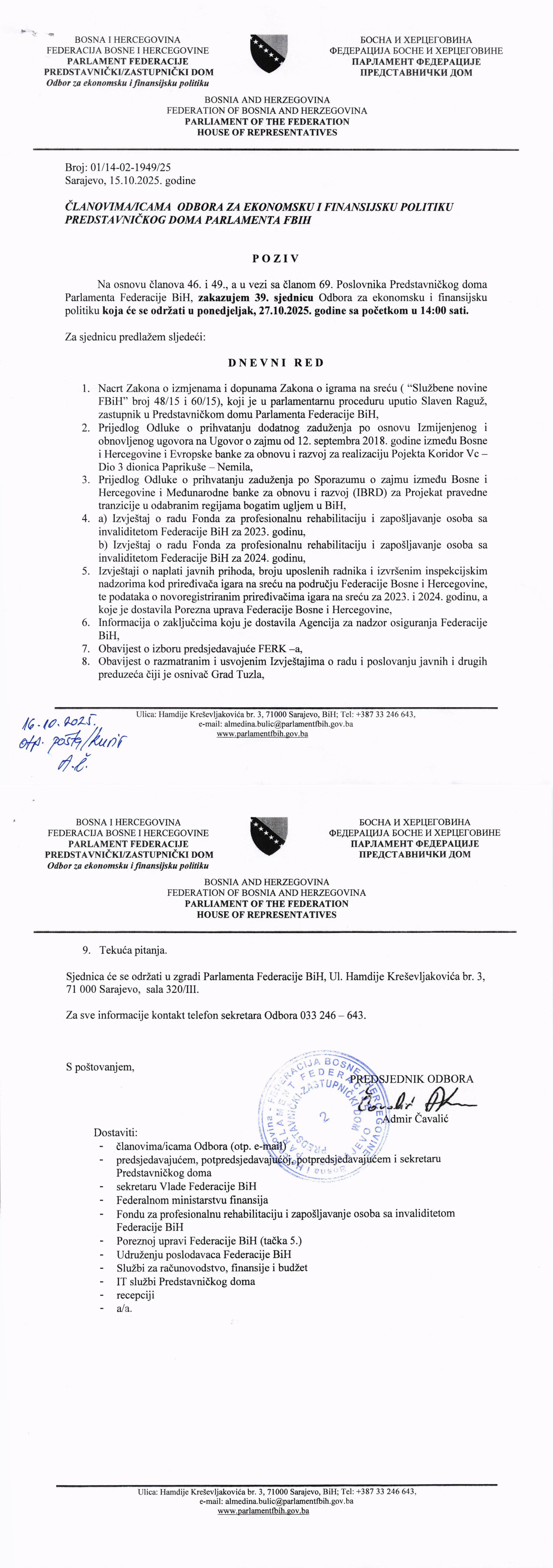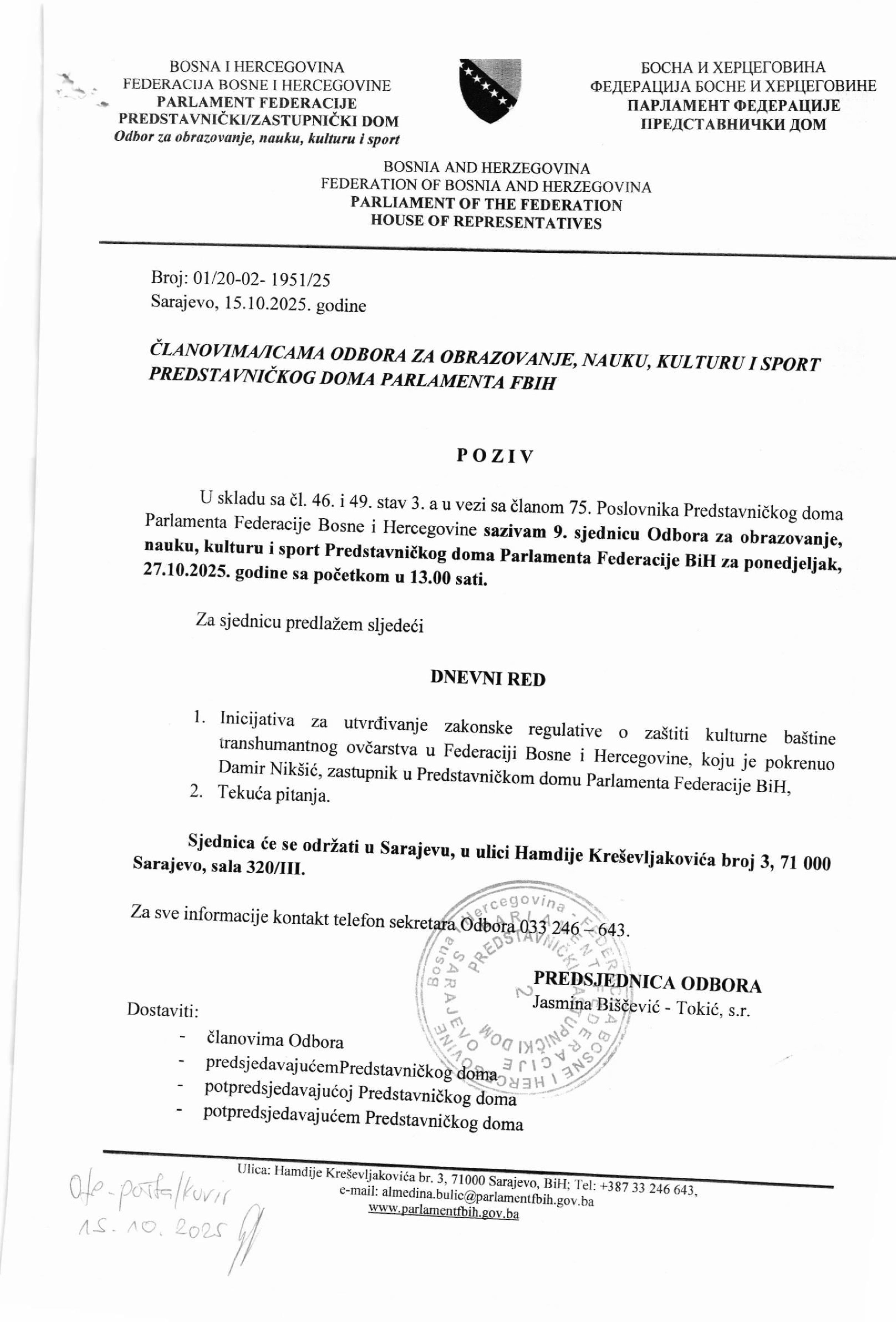 Poziv za 17. sjednicu Odbora za poljoprivredu, vodoprivredu i šumarstvo 22.10.2025 Najave Pročitaj više