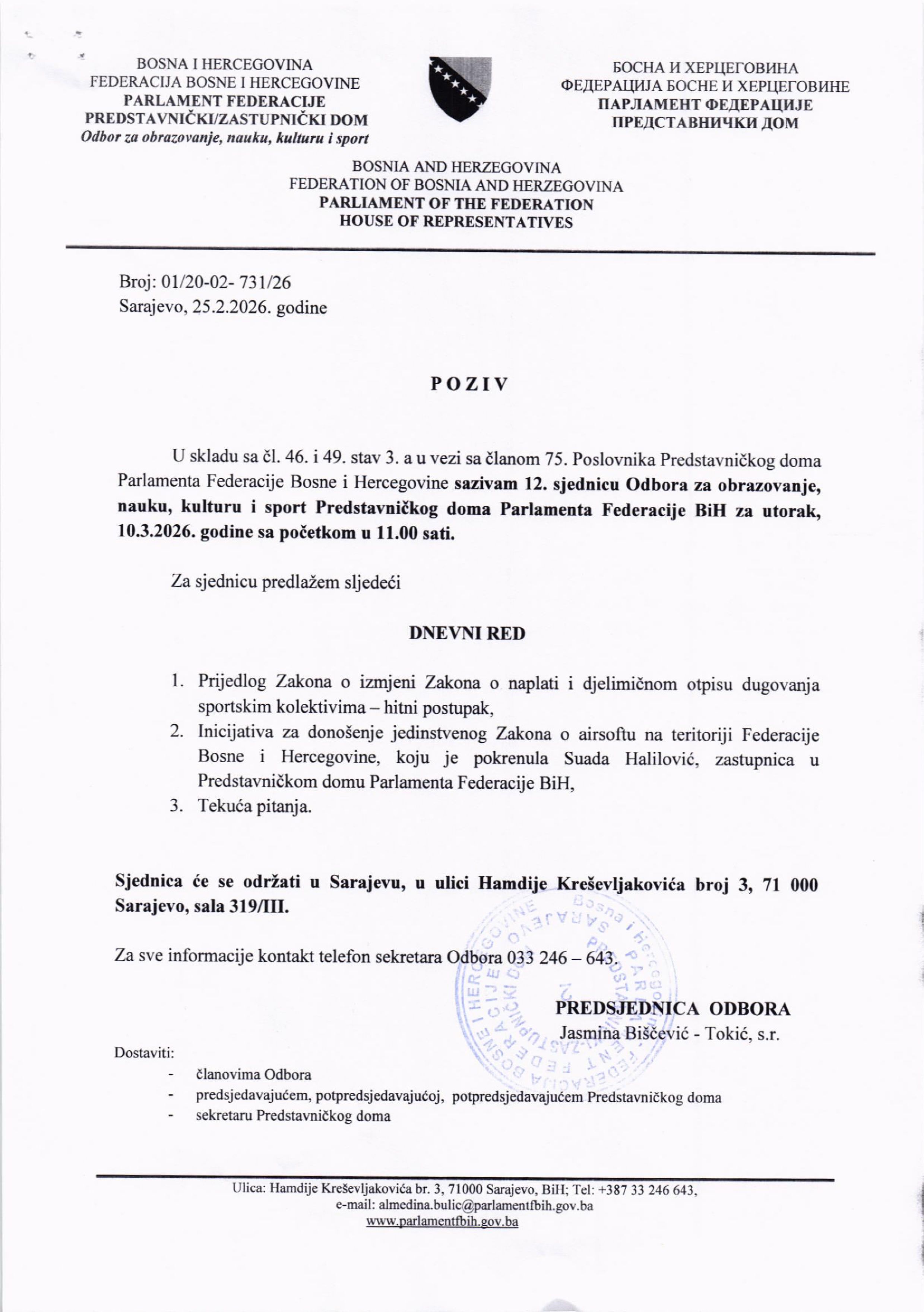 Poziv za 12. sjednicu Odbora za obrazovanje, nauku, kulturu i sport