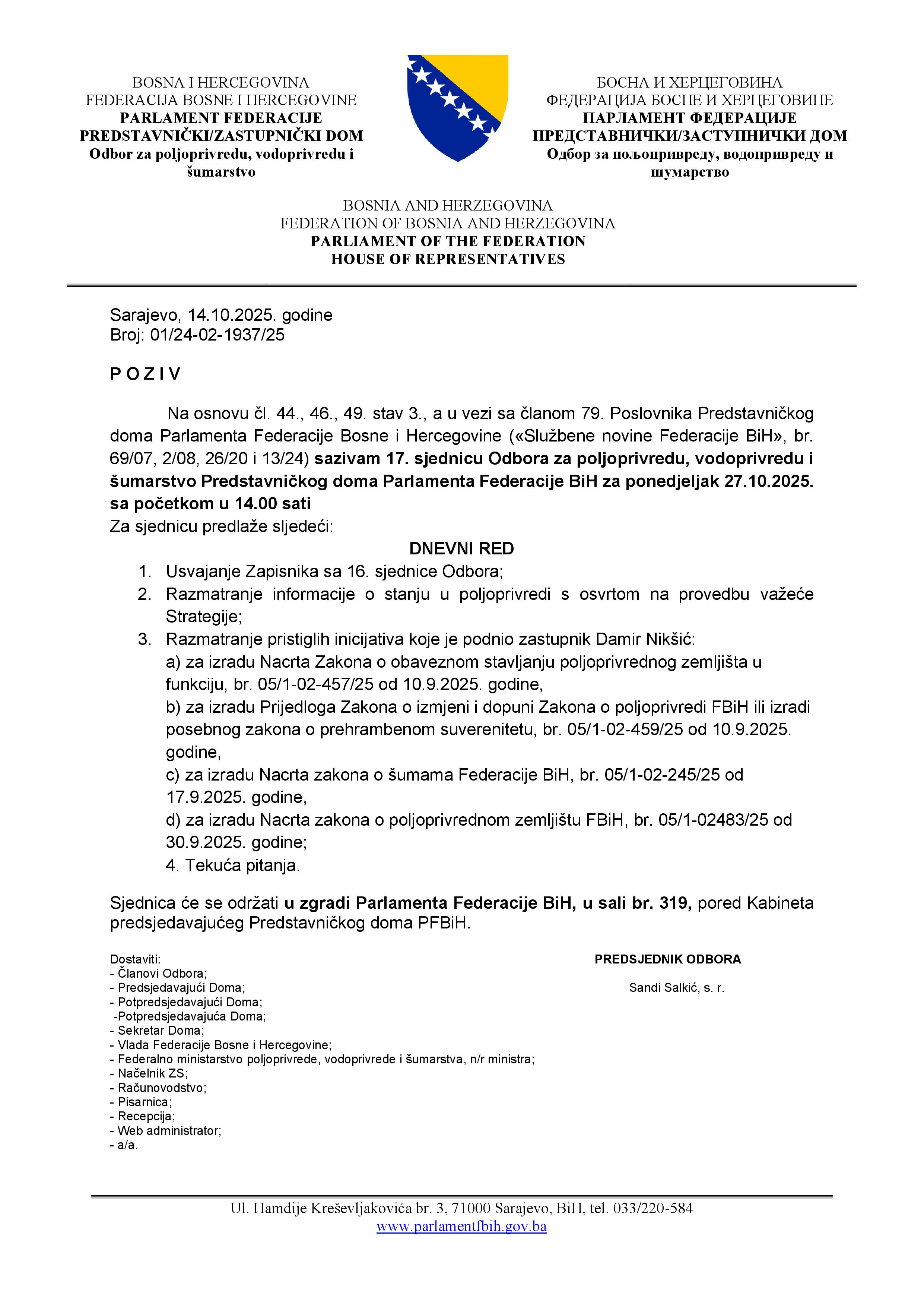 Poziv za 17. sjednicu Odbora za poljoprivredu, vodoprivredu i šumarstvo