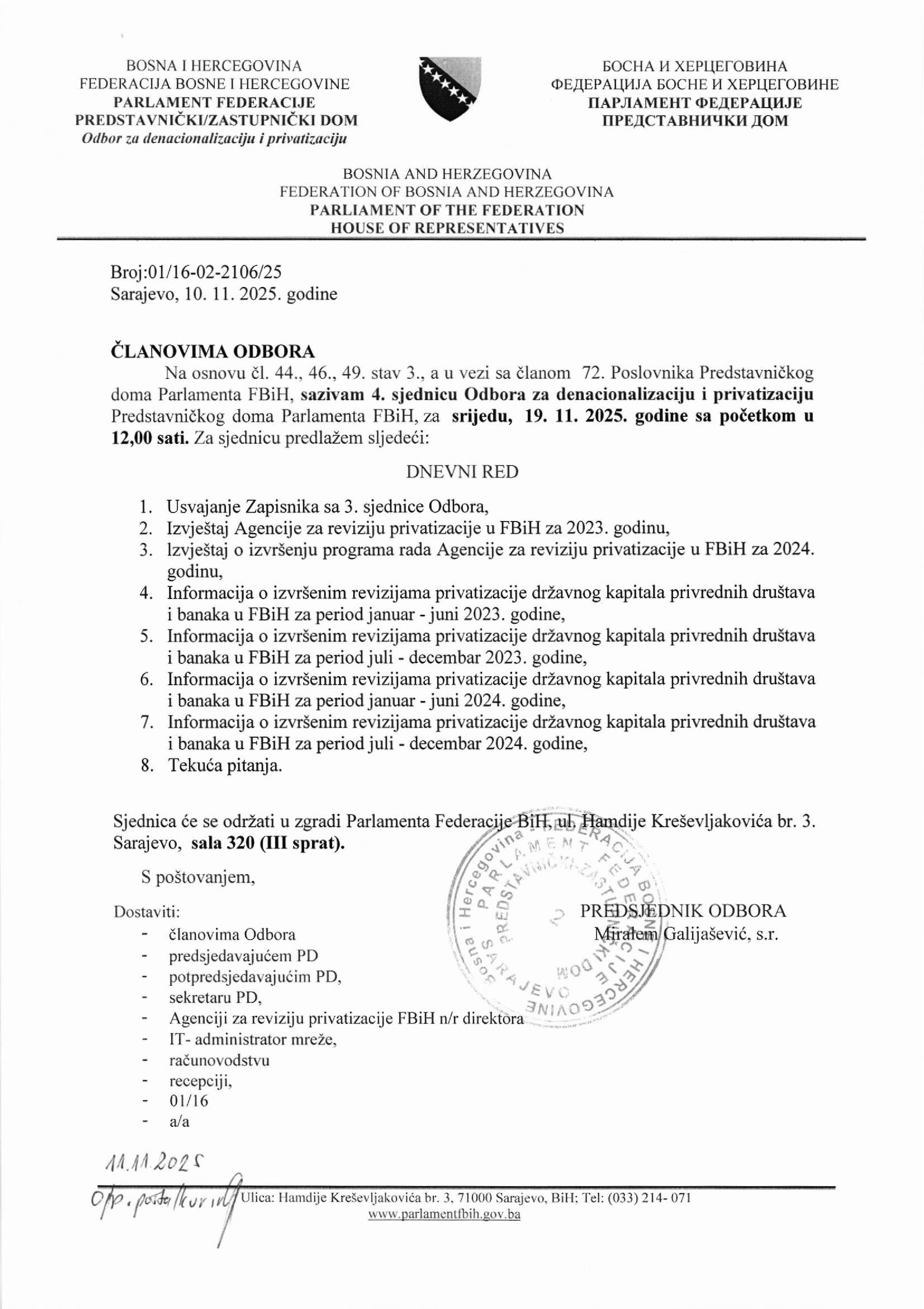 Poziv za 4. sjednicu Odbora za denacionalizaciju i privatizaciju