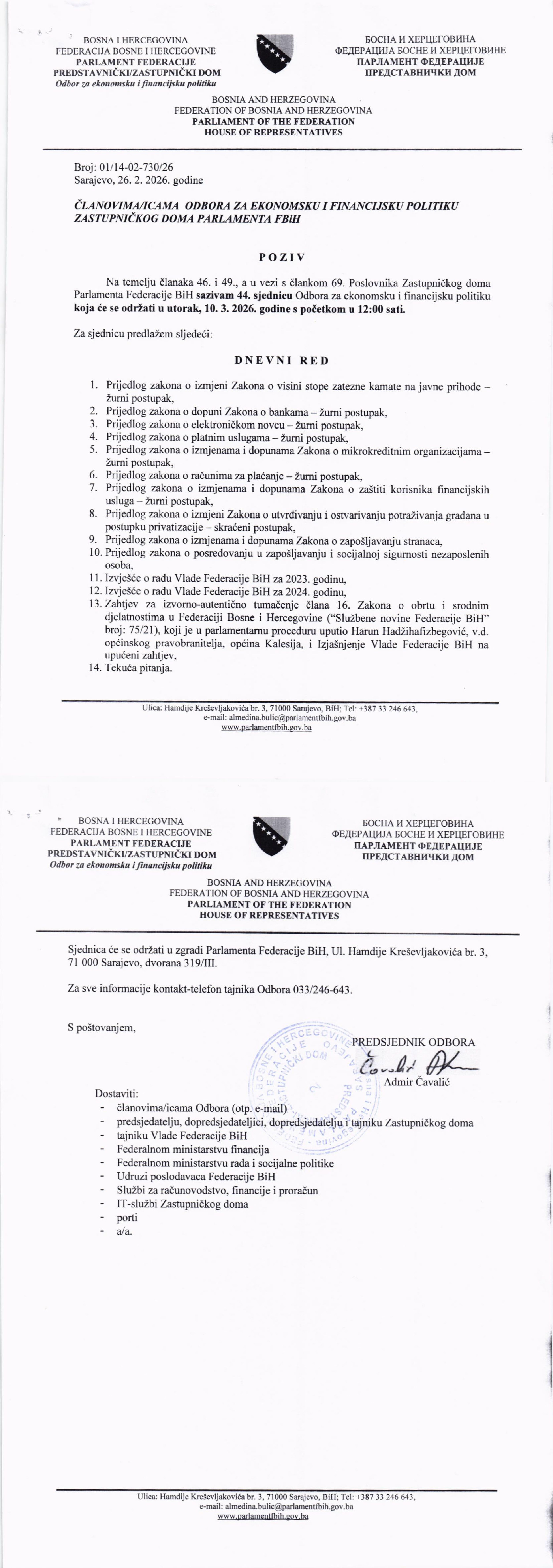 Poziv za 44. sjednicu Odbora za ekonomsku i finansijsku politiku