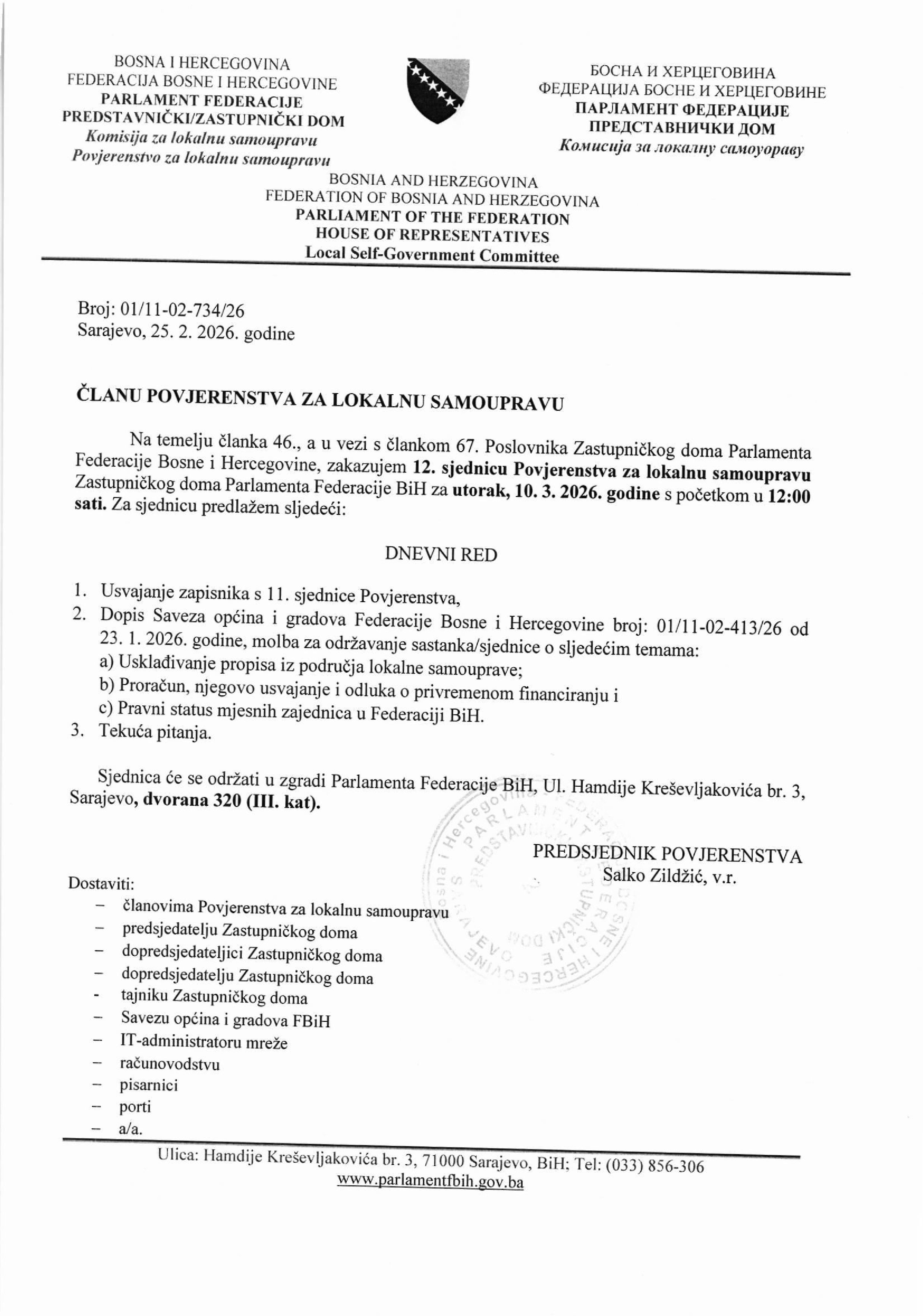 Poziv za 12. sjednicu Povjerenstva za lokalnu samoupravu