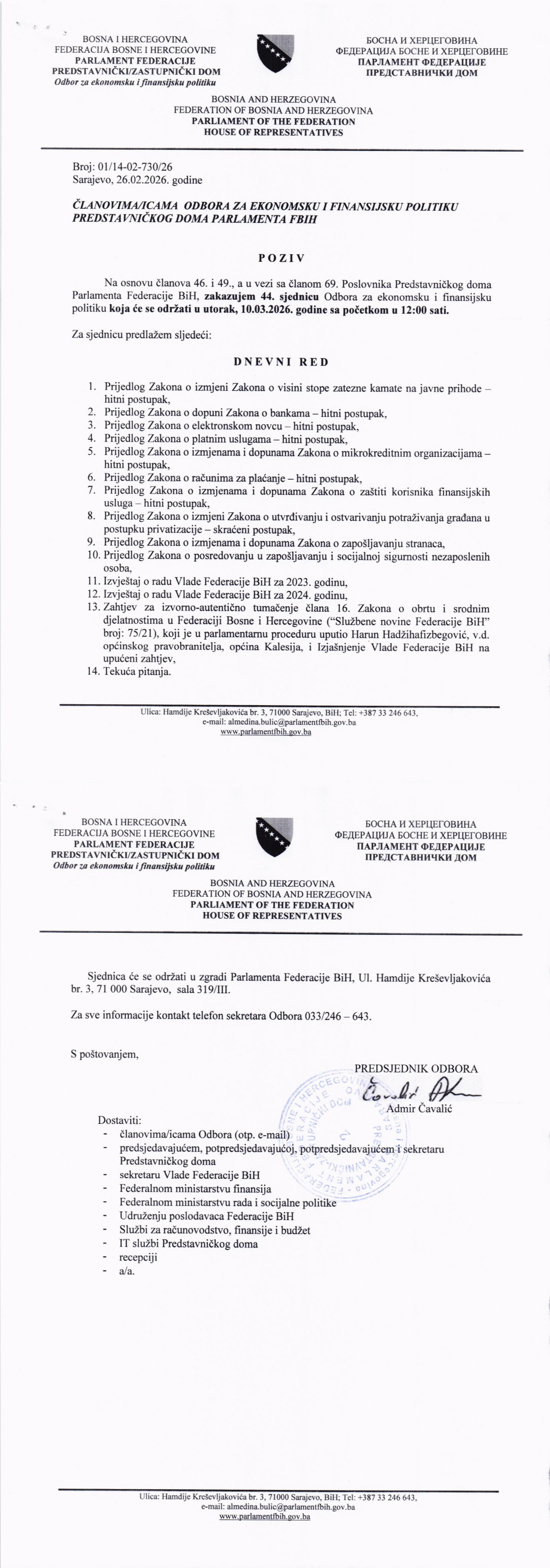 Poziv za 44. sjednicu Odbora za ekonomsku i financijsku politiku