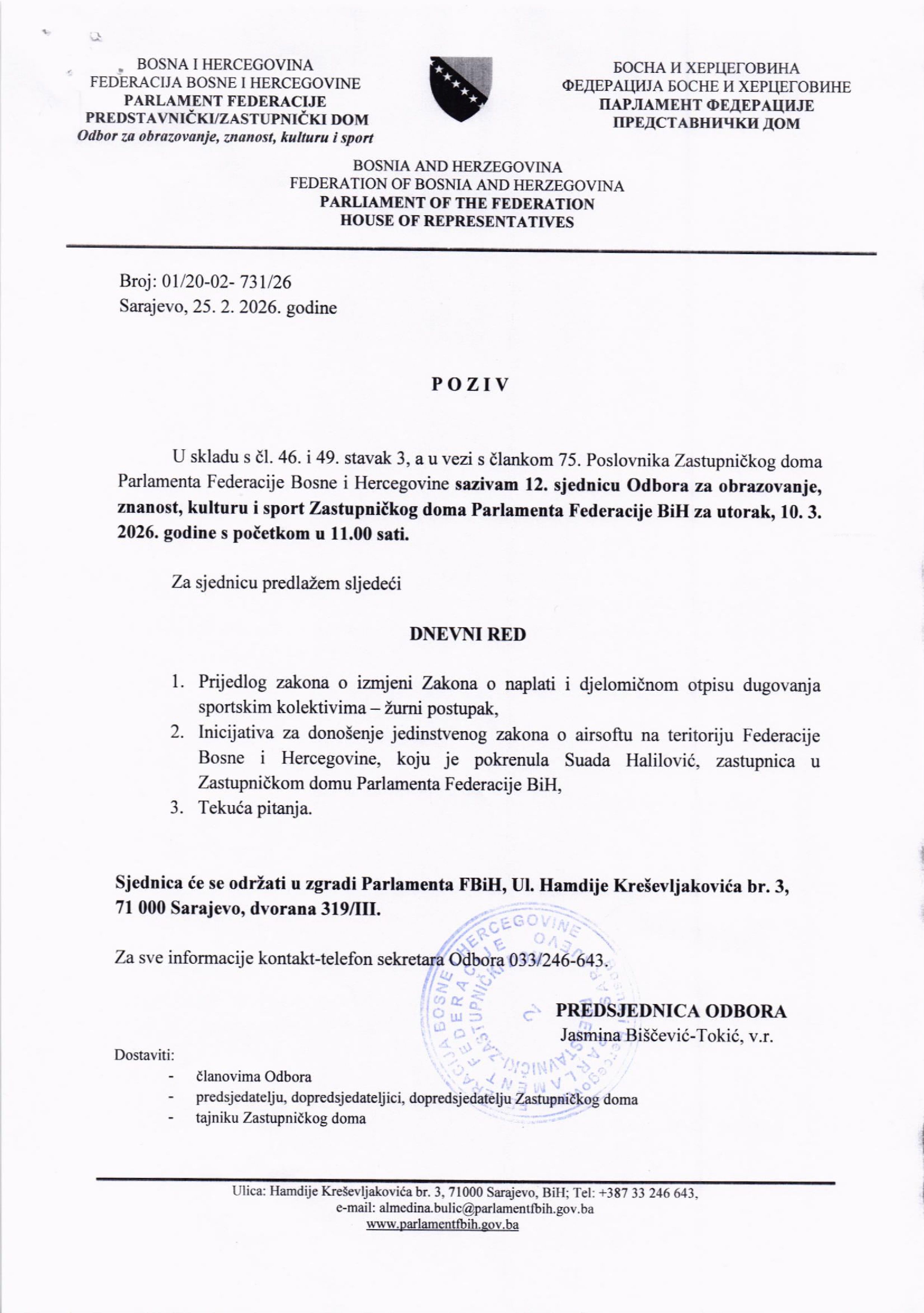 Poziv za 12. sjednicu Odbora za obrazovanje, nauku, kulturu i sport