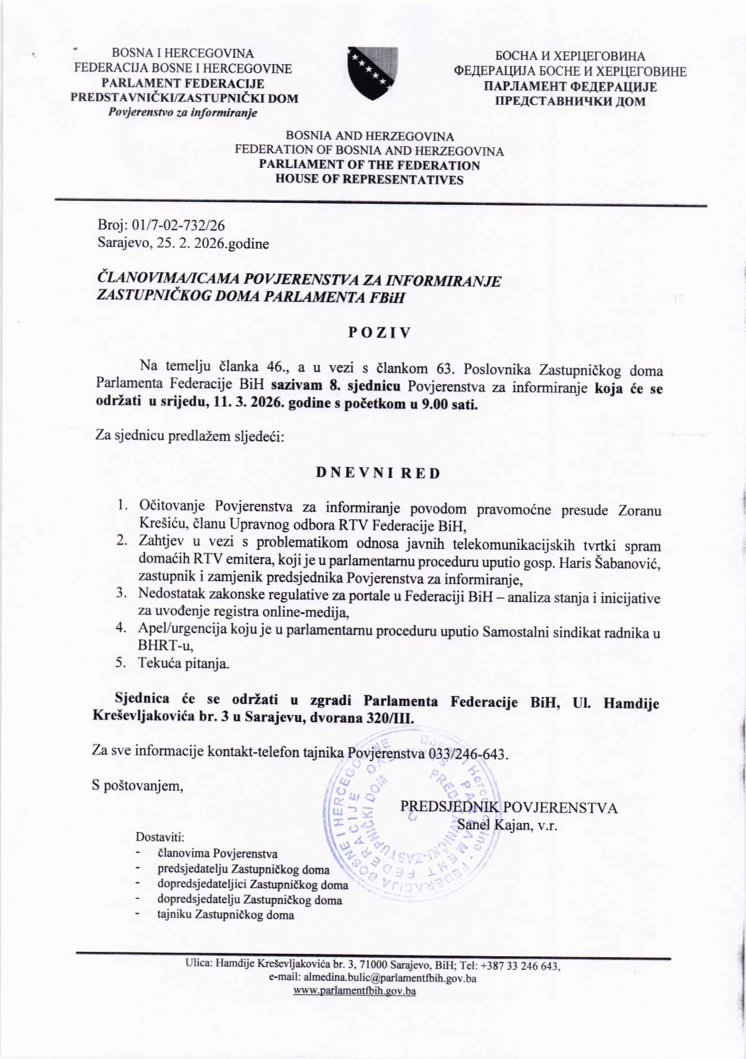 Poziv za 8. sjednicu Povjerenstva za informiranje