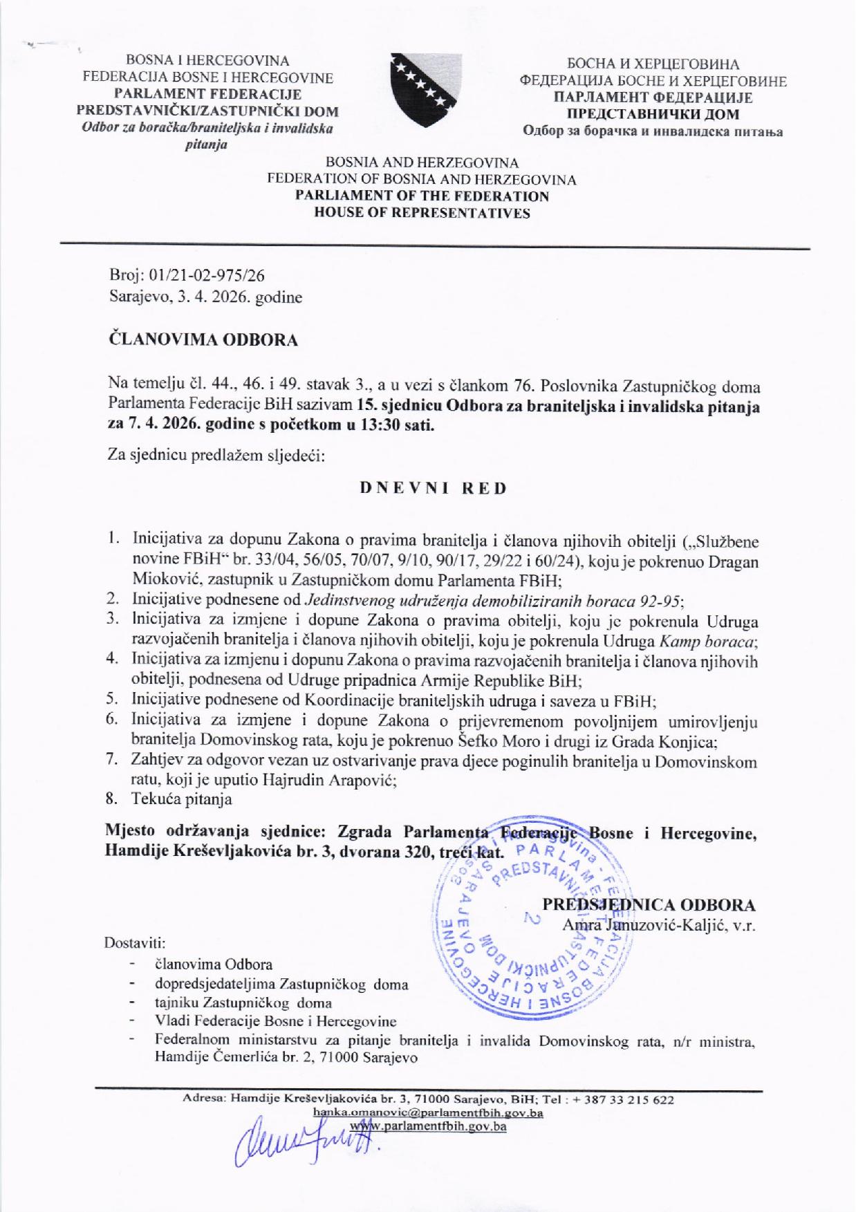 Poziv za 15. sjednicu Odbora za braniteljska pitanja