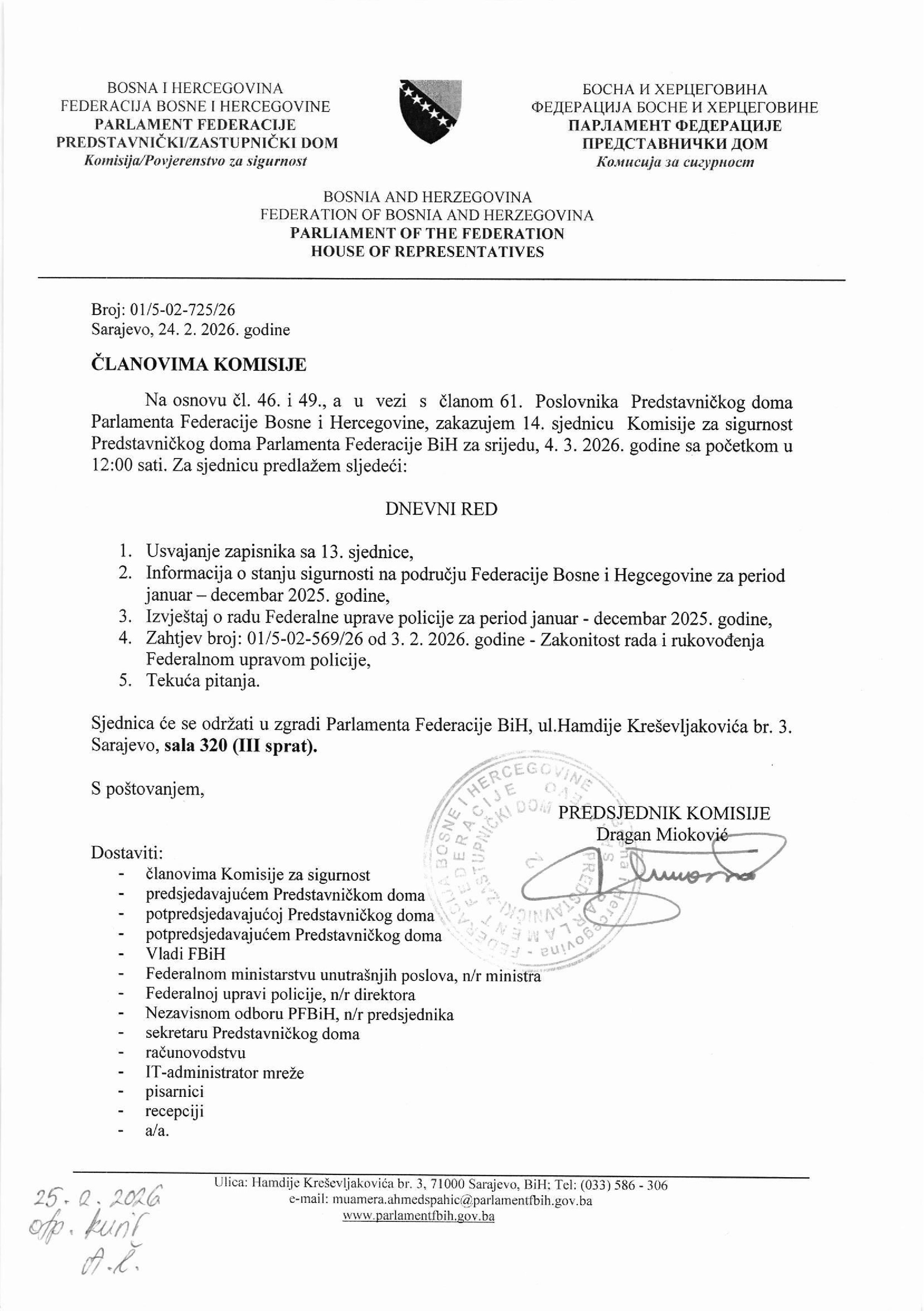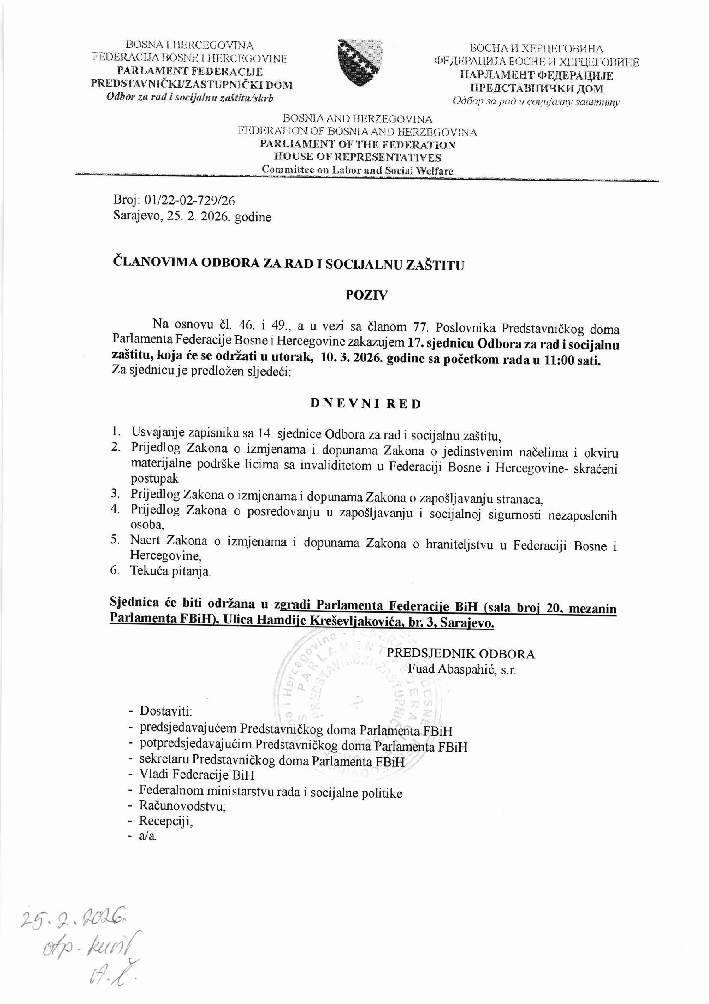 Poziv za 19. sjednicu Odbora za poljoprivredu, vodoprivredu i šumarstvo 16.02.2026 Najave Pročitaj više