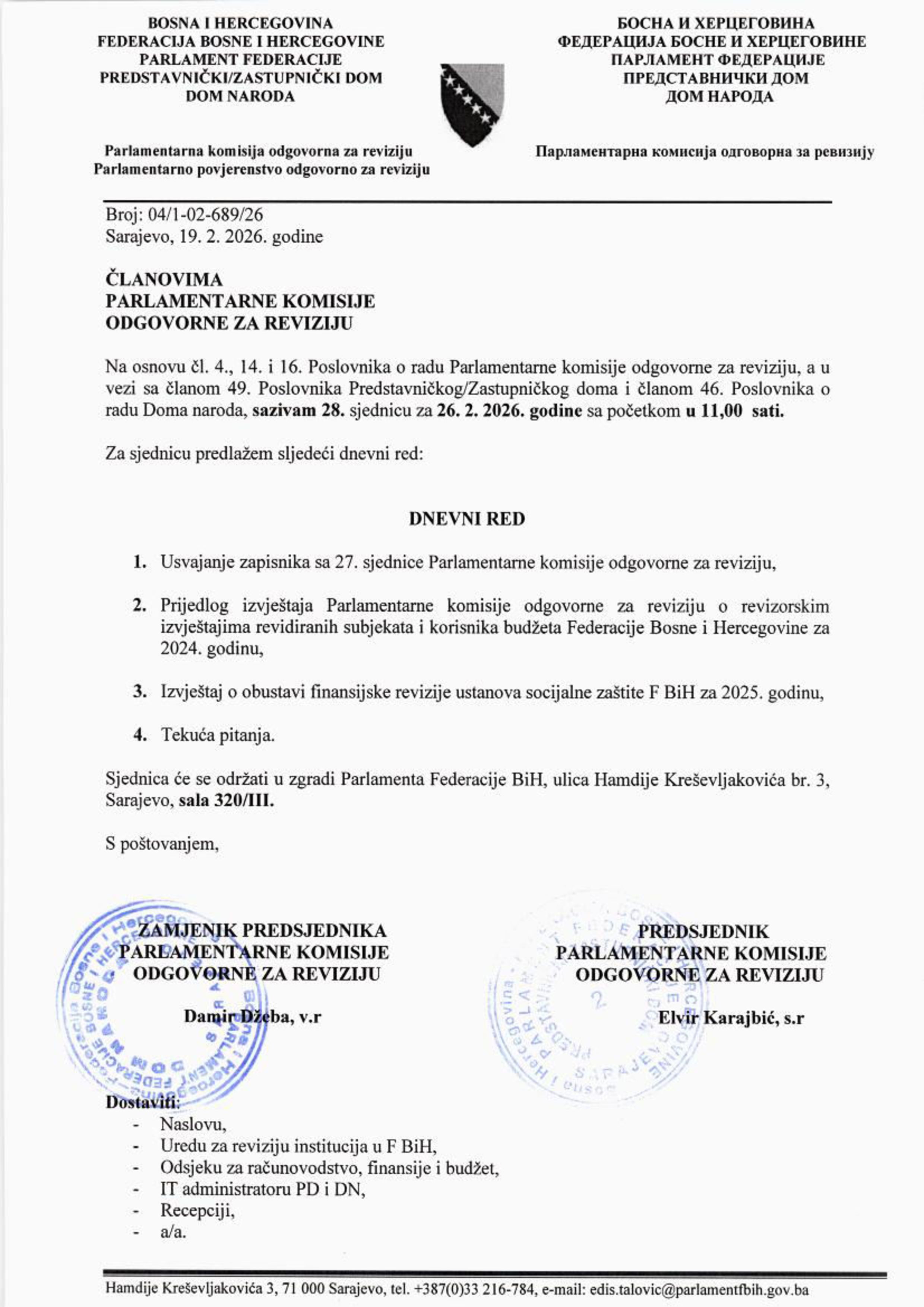 Poziv za 1. sjednicu Radne skupine za provedbu postupka izbora dvoje sudija Ustavnog suda BiH 03.02.2026 Najave Pročitaj više