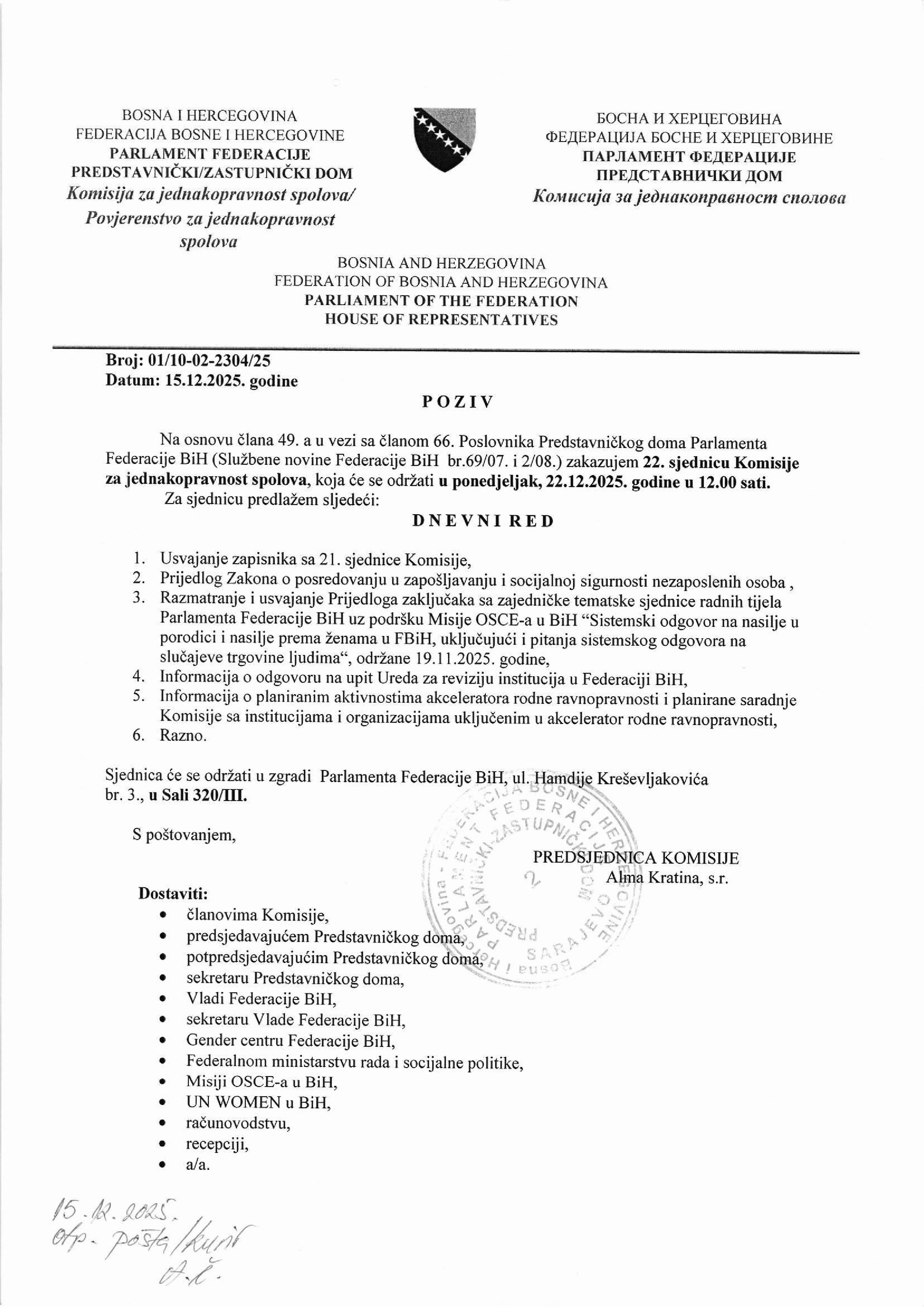 Poziv za 22. sjednicu Komisije za jednakopravnost spolova