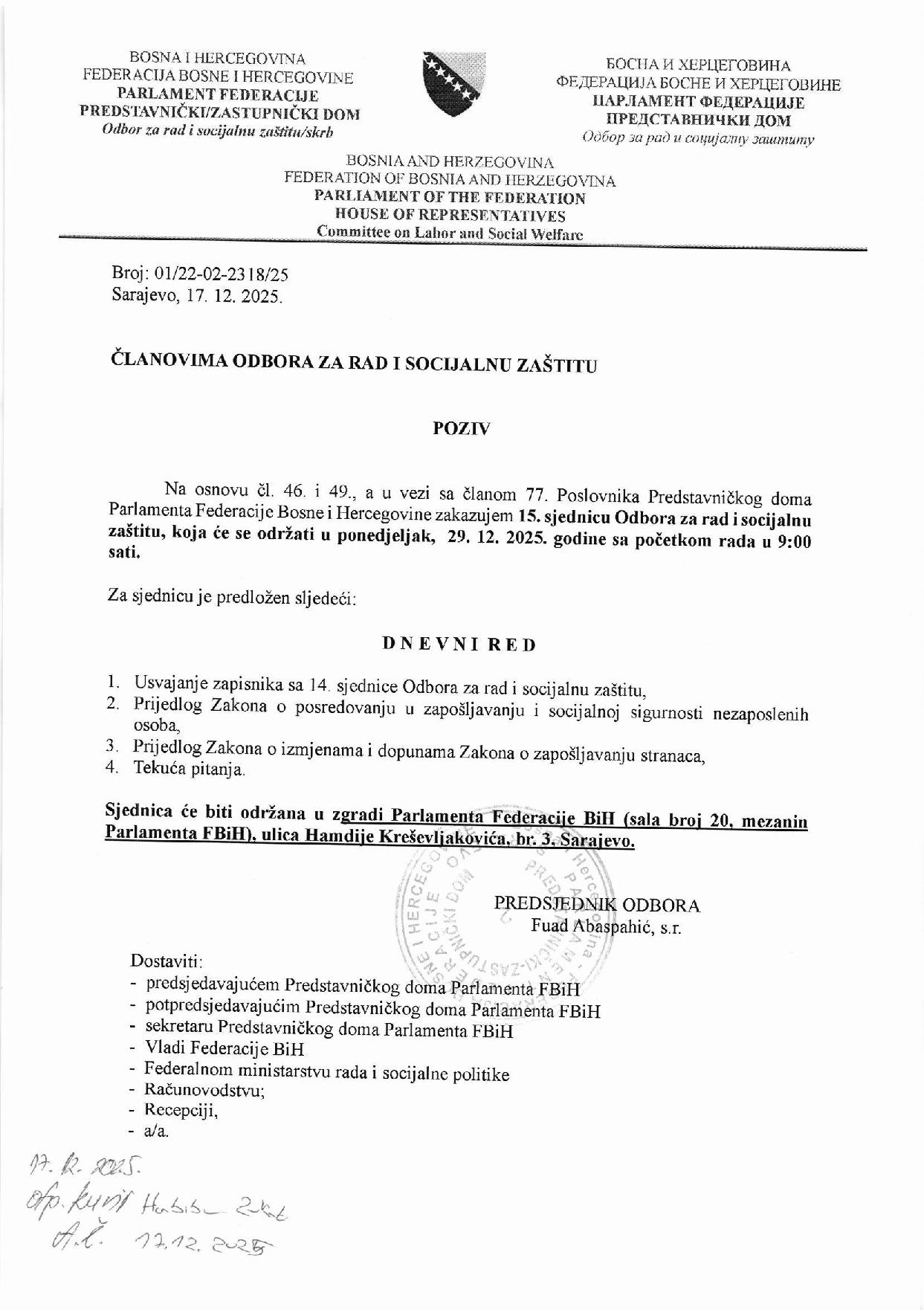 15. sjednica Odbora za rad i socijalnu zaštitu