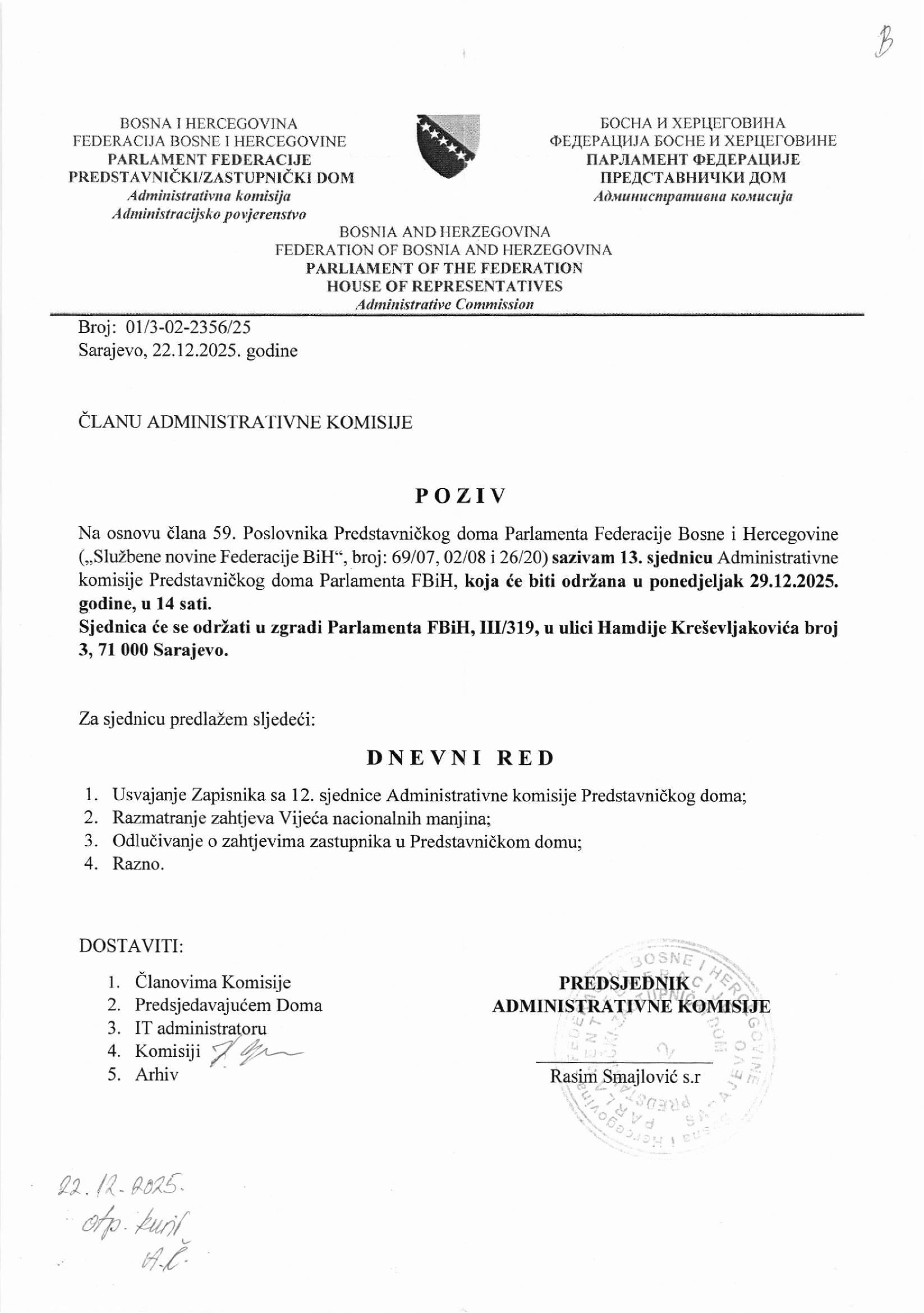 Poziv za 13. sjednicu Administrativne komisije