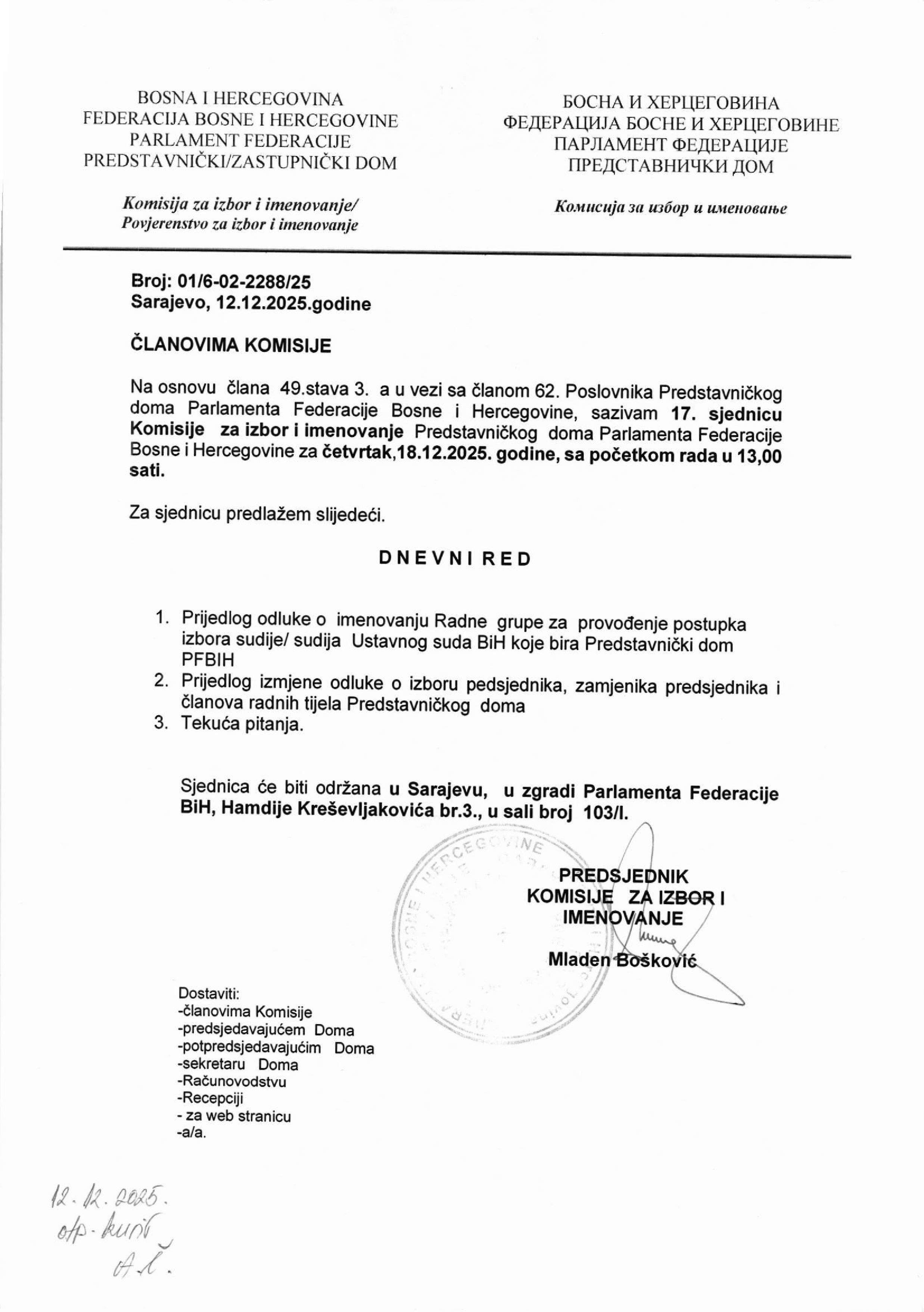 Poziv za 17. sjednicu Komisije za izbor i imenovanje