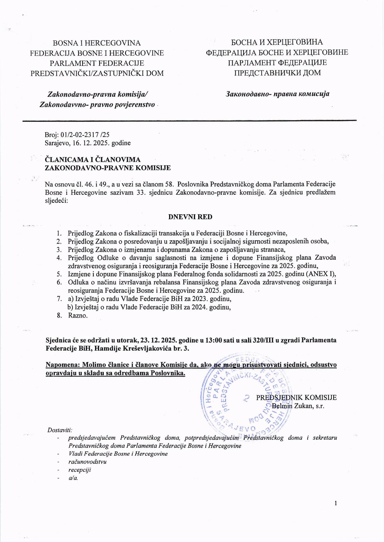 Poziv za 33. sjednicu Zakonodavno-pravne komisije