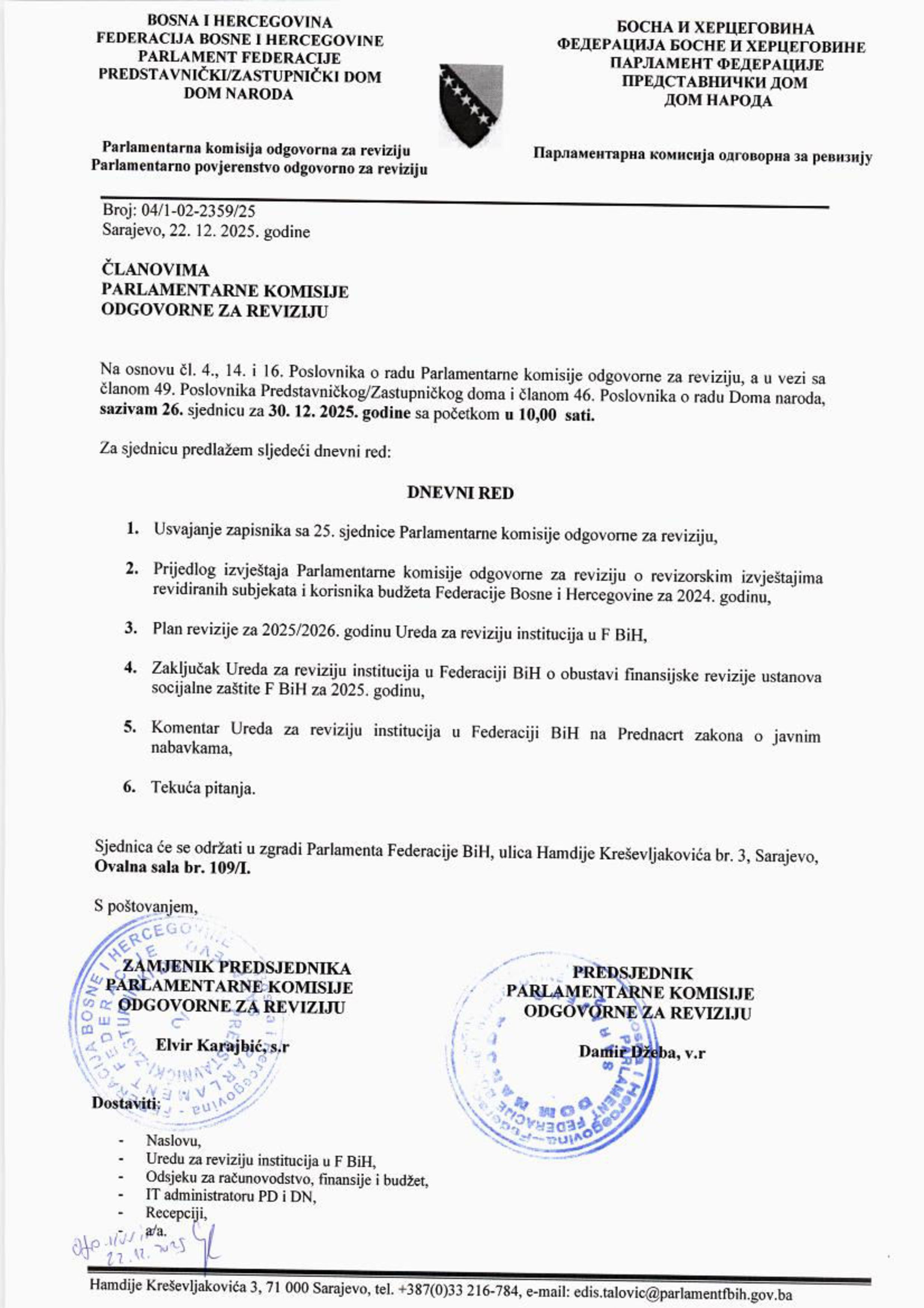 Poziv za 25. sjednicu Parlamentarne Komisije odgovorne za reviziju