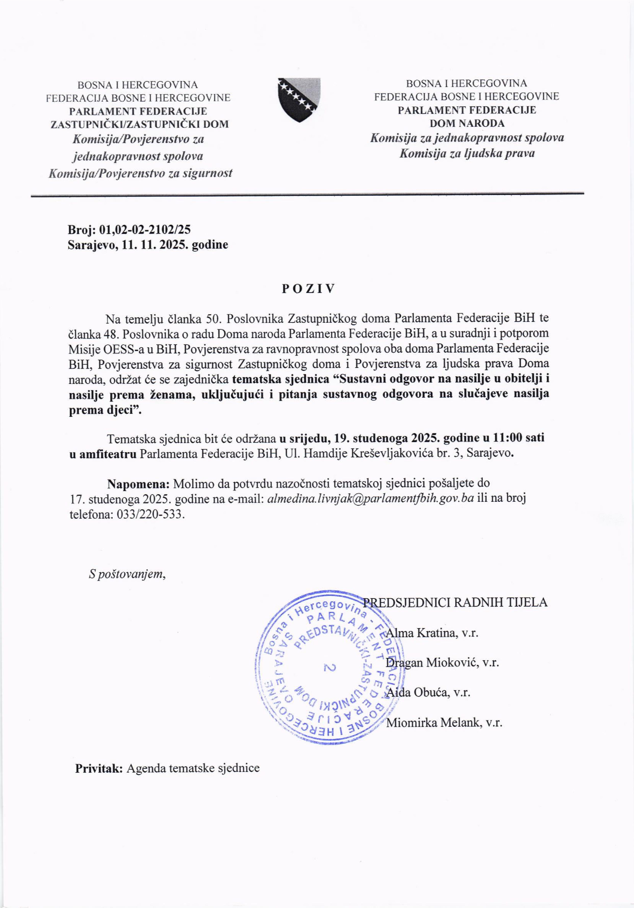 Tematska sjednica o Sustavnom odgovoru na nasilje u obitelji i nasilja prema ženama, uključujući i pitanja sistemskog odgovora na slučajeve nasilja prema djeci 12.11.2025 Vijesti HR AGENDA TEMATSKE SJEDNICE