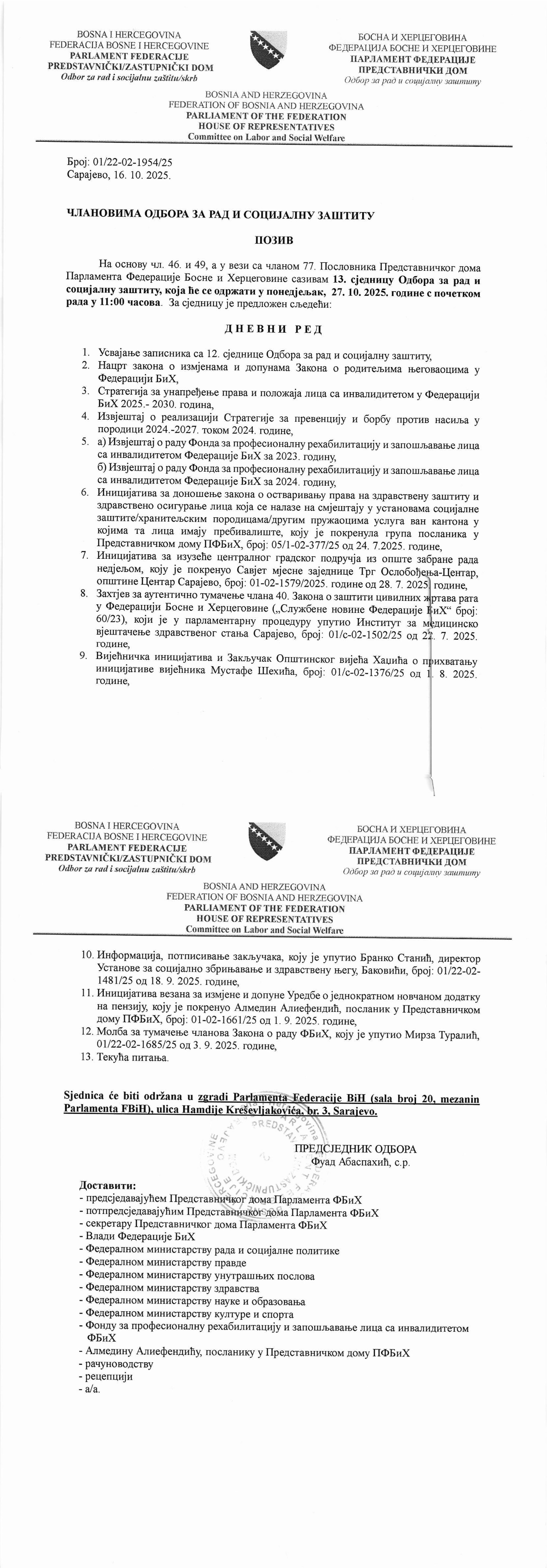 Позив за 13. сједницу Одбора за рад и социјалну заштиту