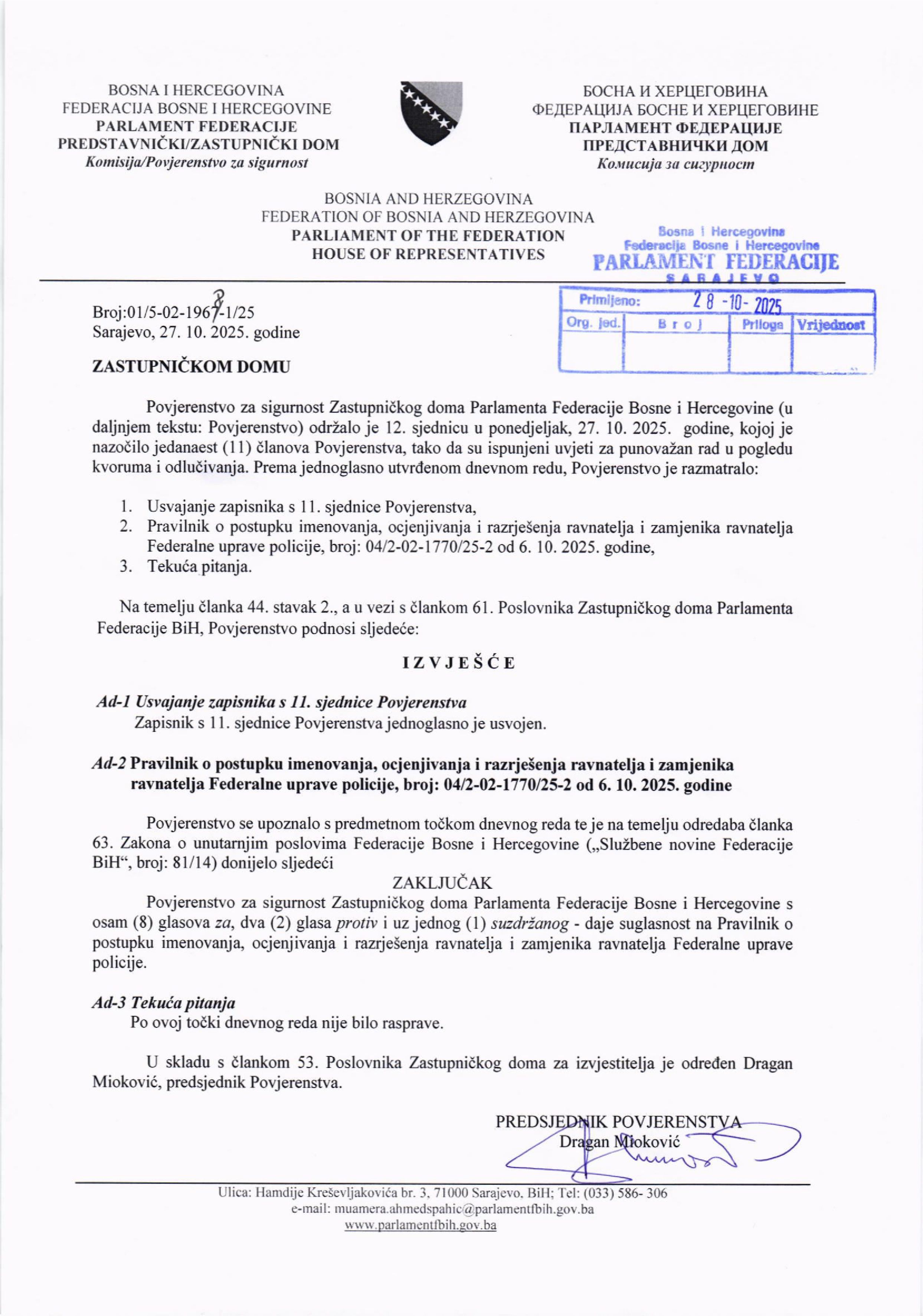 | Contact | Povjerenstvo za sigurnost Muamera Ahmedspahić, Muamera Ahmedspahić, stručni savjetnik u Kabinetu predsjedavajućeg Tel: +387 33 586-306;  |