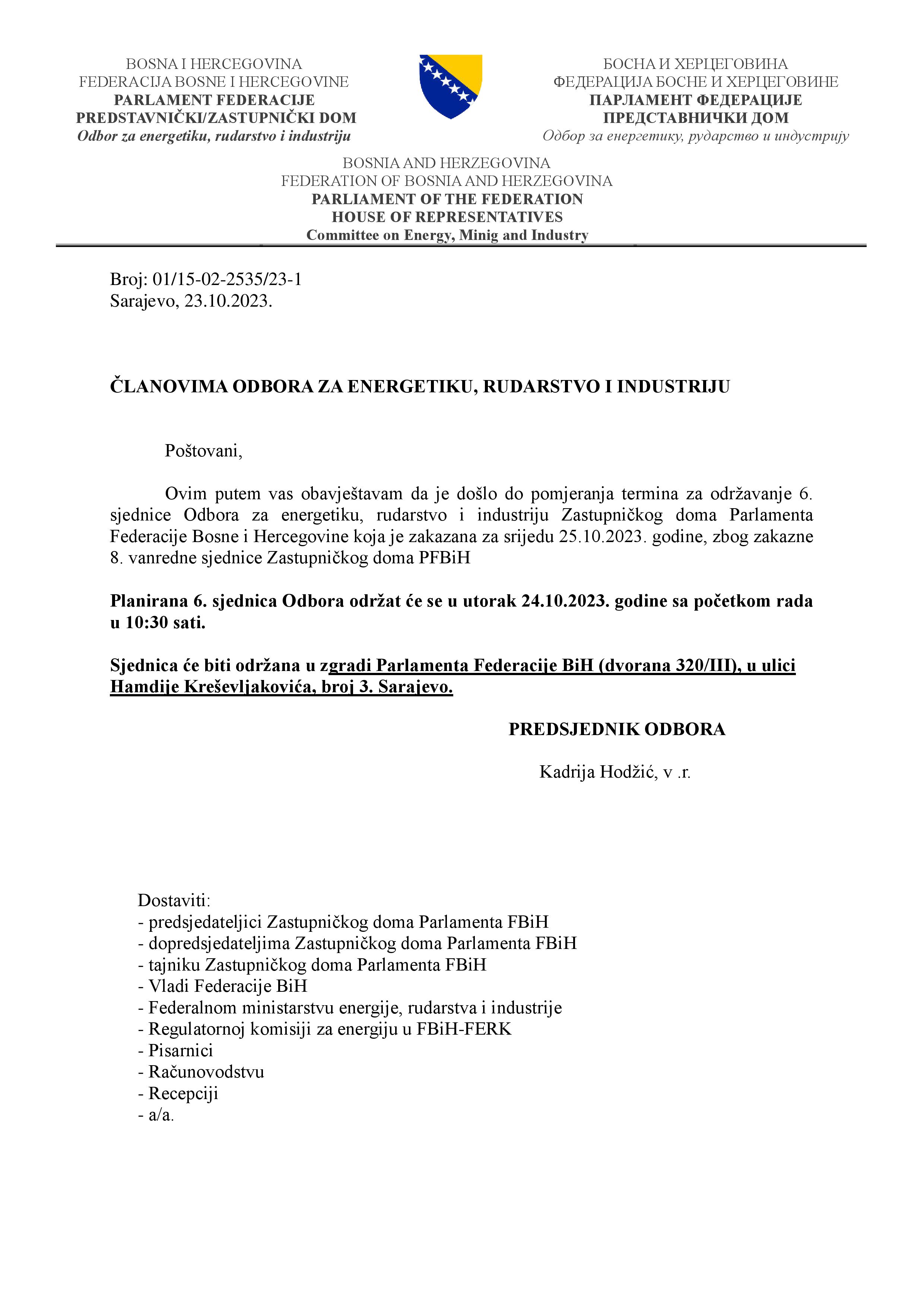 Obavijest o pomjeranju termina za održavanje 6. sjednice Odbora za energetiku, rudarstvo i industriju 23.10.2023 Najave HR Pročitaj više