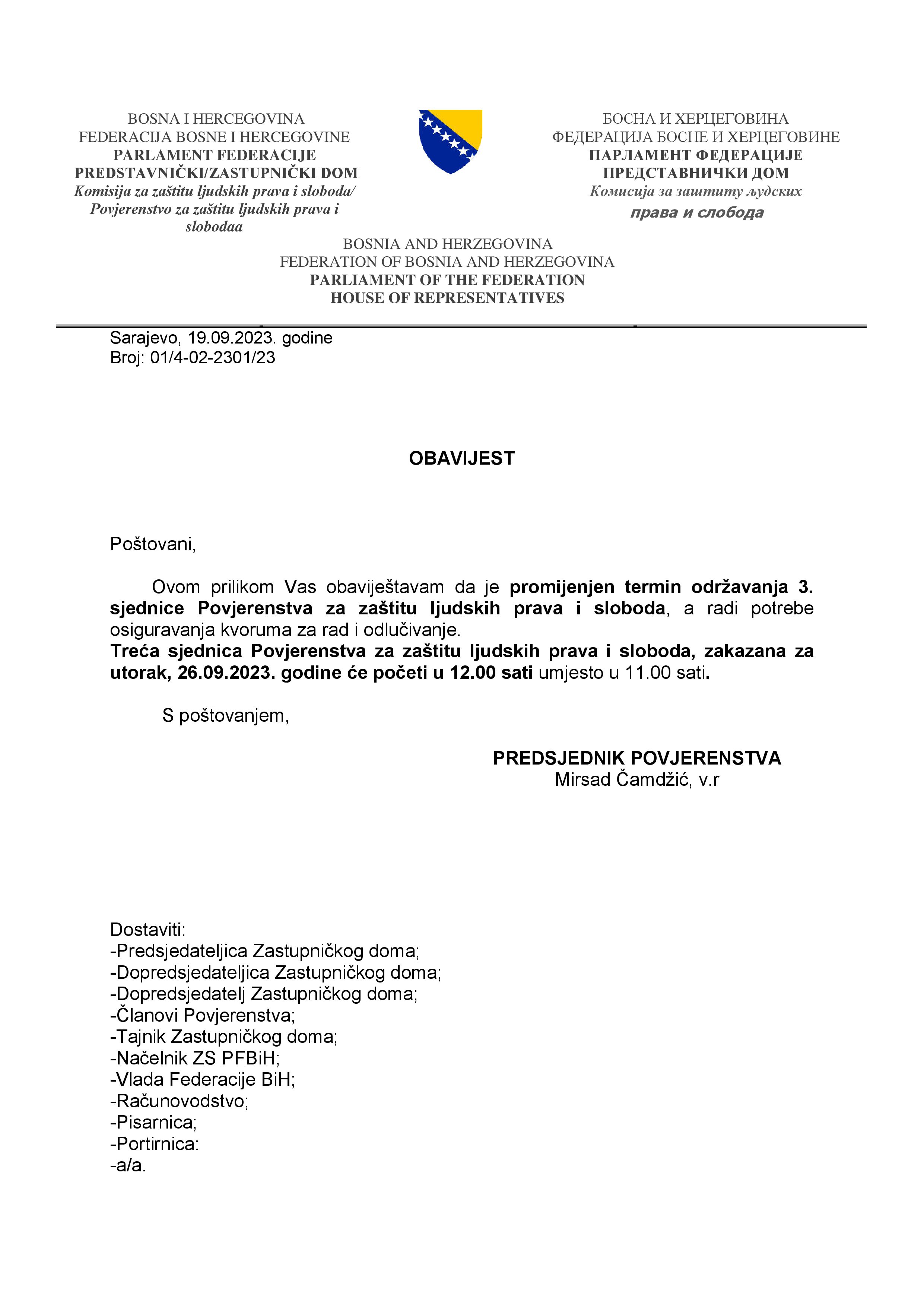 Obavijest o promjeni termina održavanja 3. sjednice Povjerenstva za zaštitu ljudskih prava i sloboda 19.09.2023 Najave HR Pročitaj više