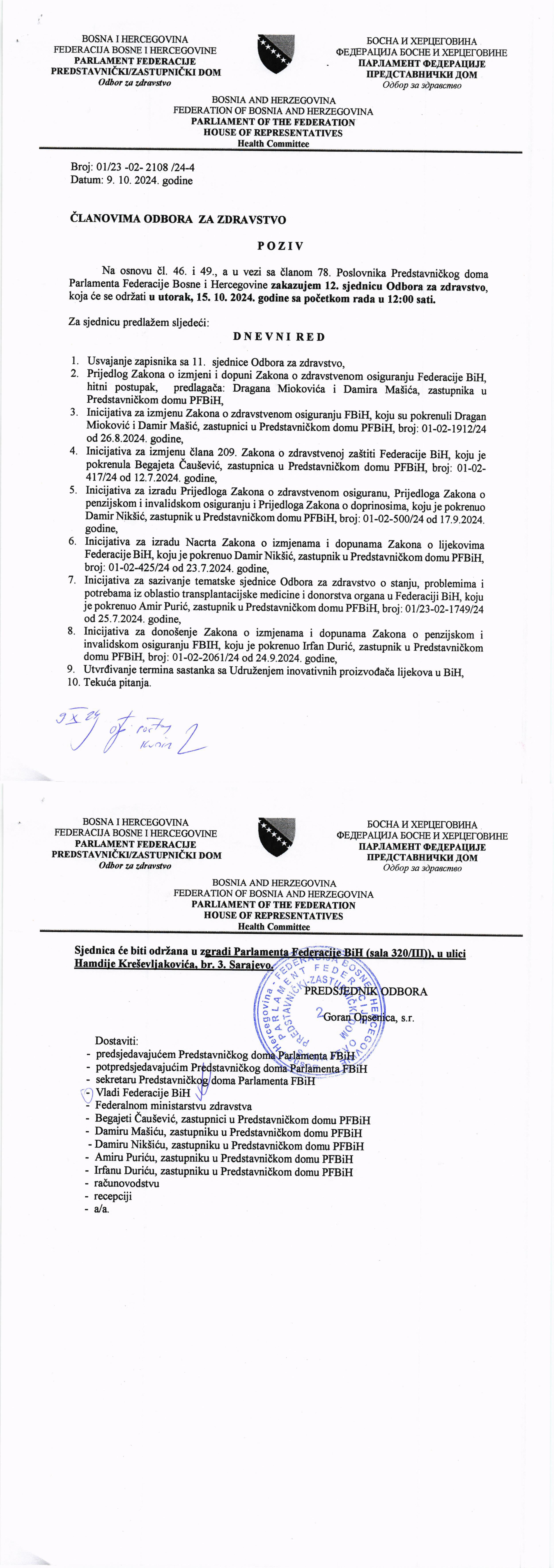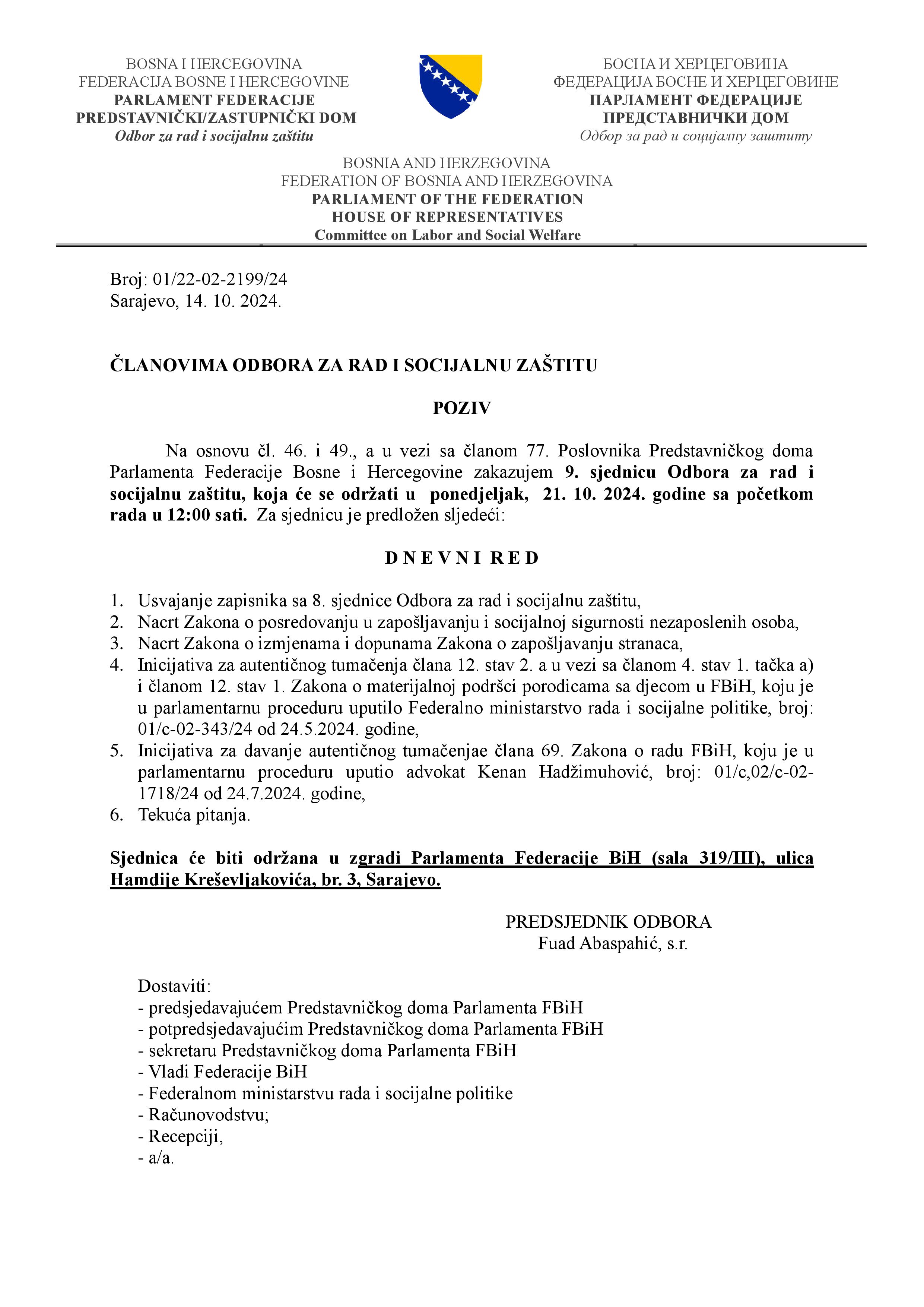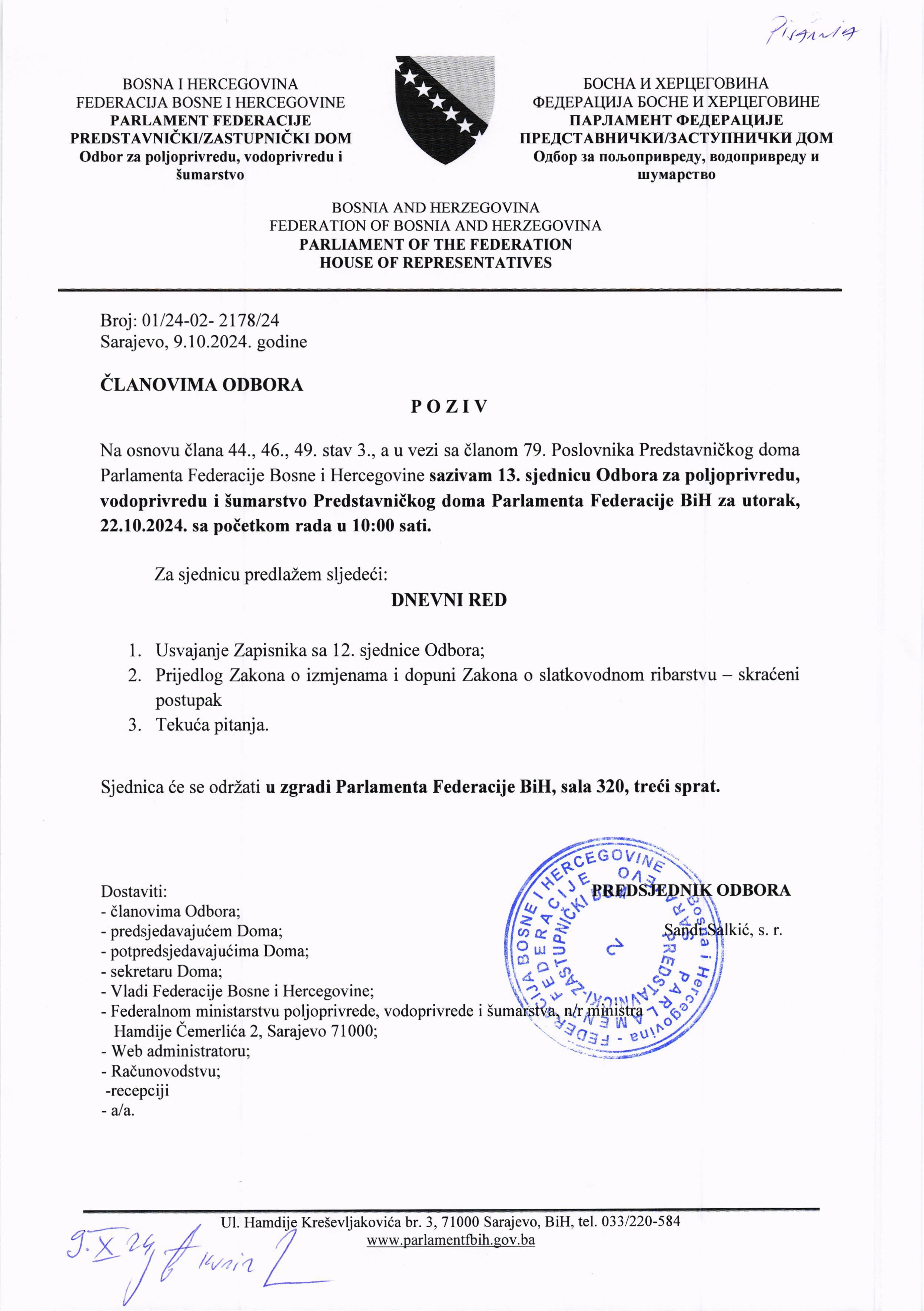 Poziv za 13. sjednicu Odbora za poljoprivredu, vodoprivredu i šumarstvo 10.10.2024 Najave Pročitaj više