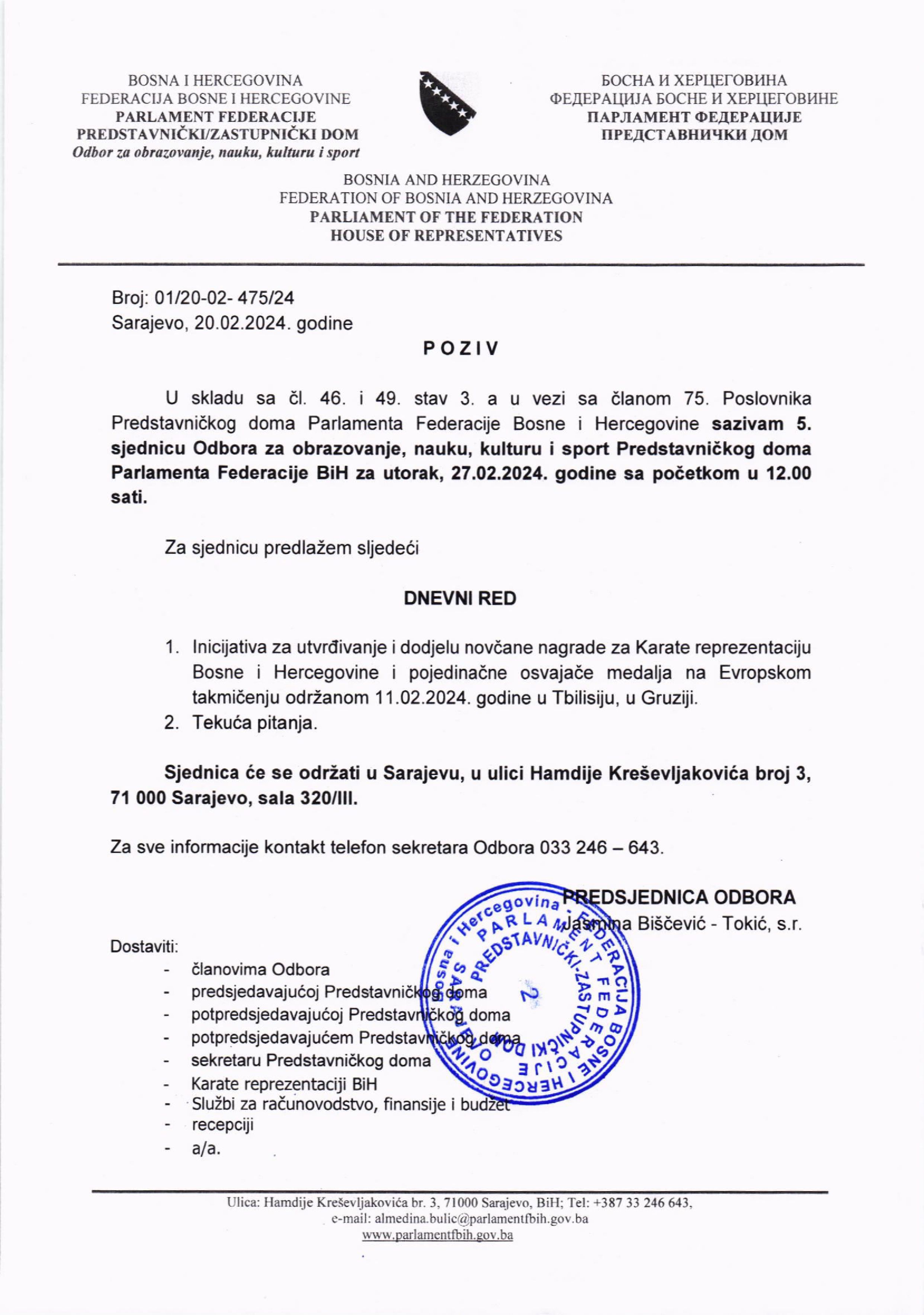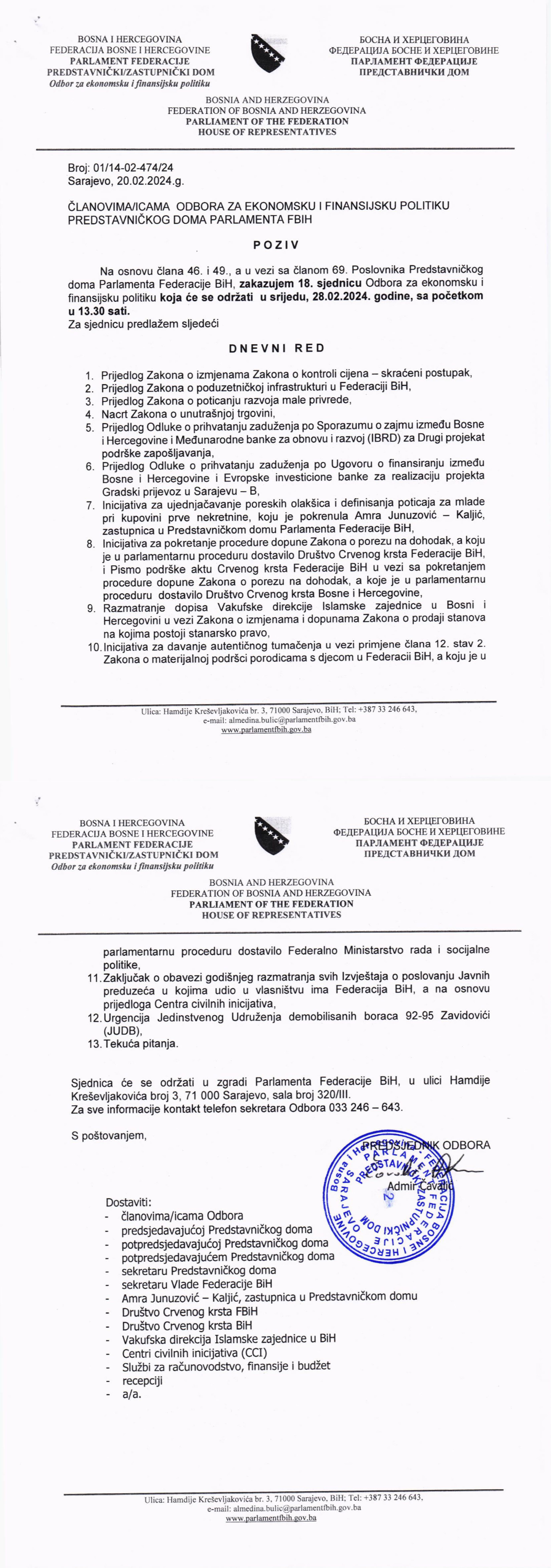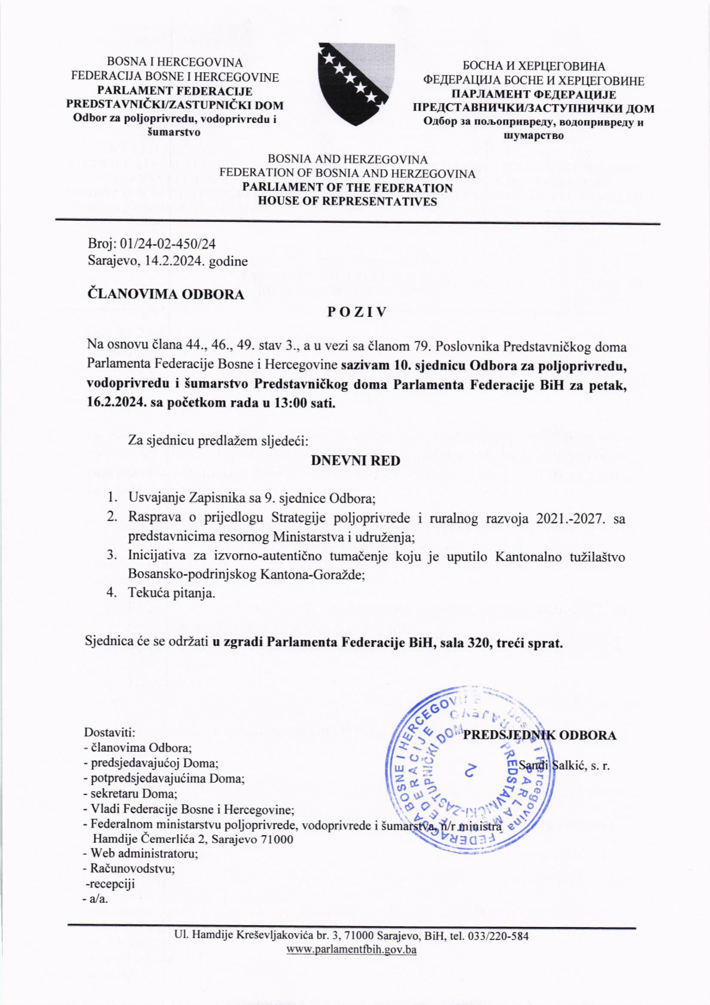 Poziv za 10. sjednicu Odbora za poljoprivredu, vodoprivredu i šumarstvo 15.02.2024 Najave Pročitaj više