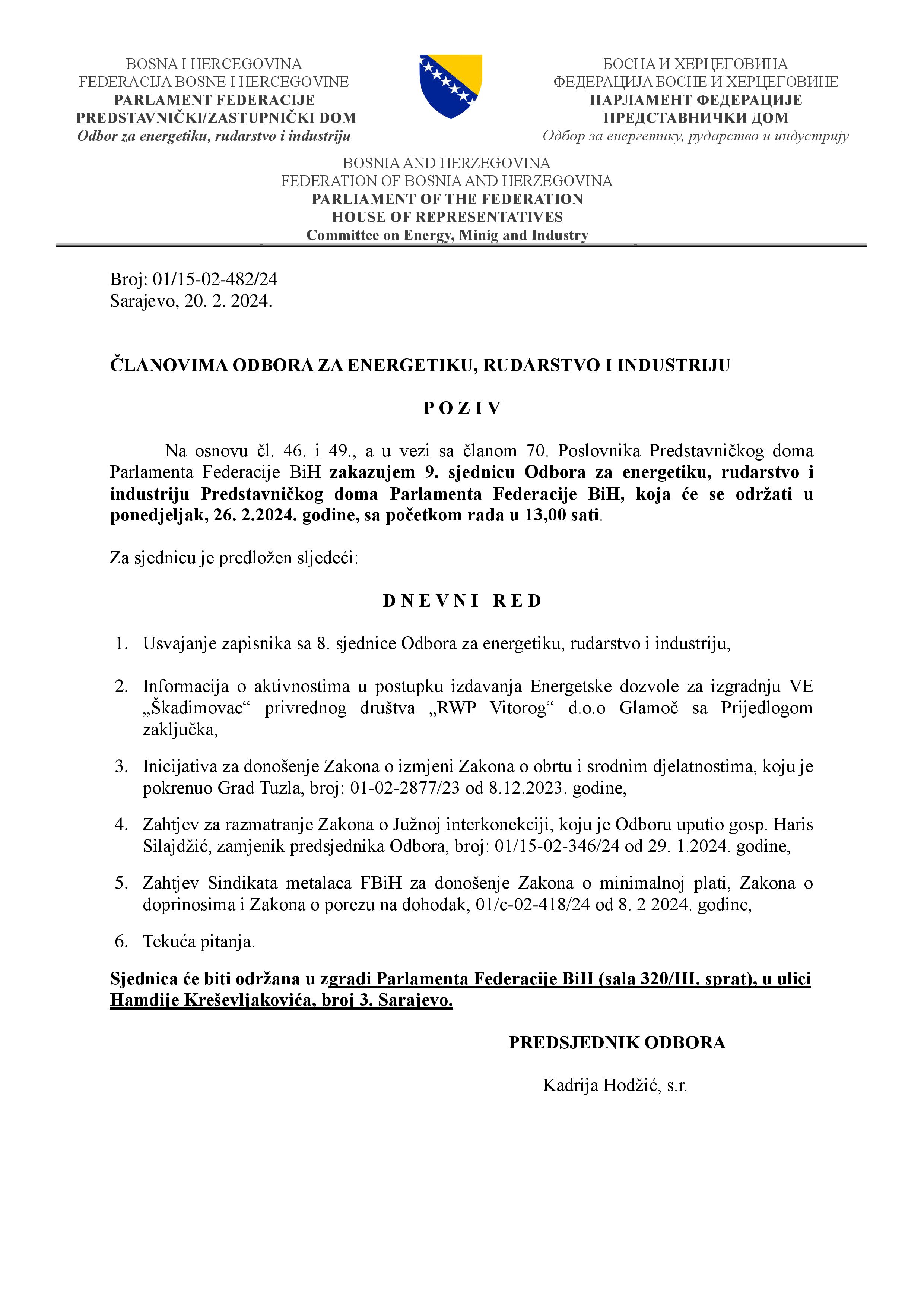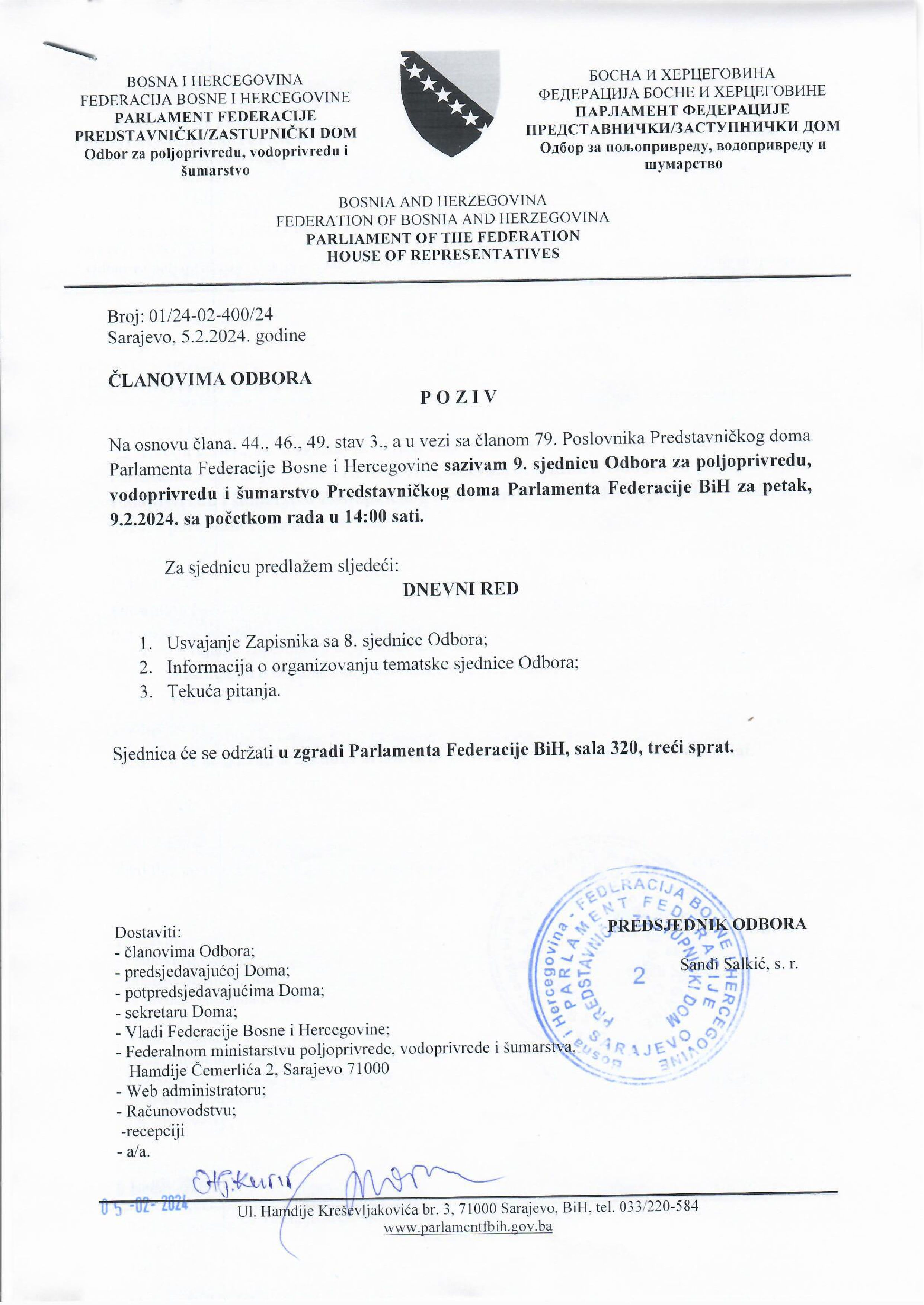 Poziv za 9. sjednicu Odbora za poljoprivredu, vodoprivredu i šumartstvo 07.02.2024 Najave Pročitaj više