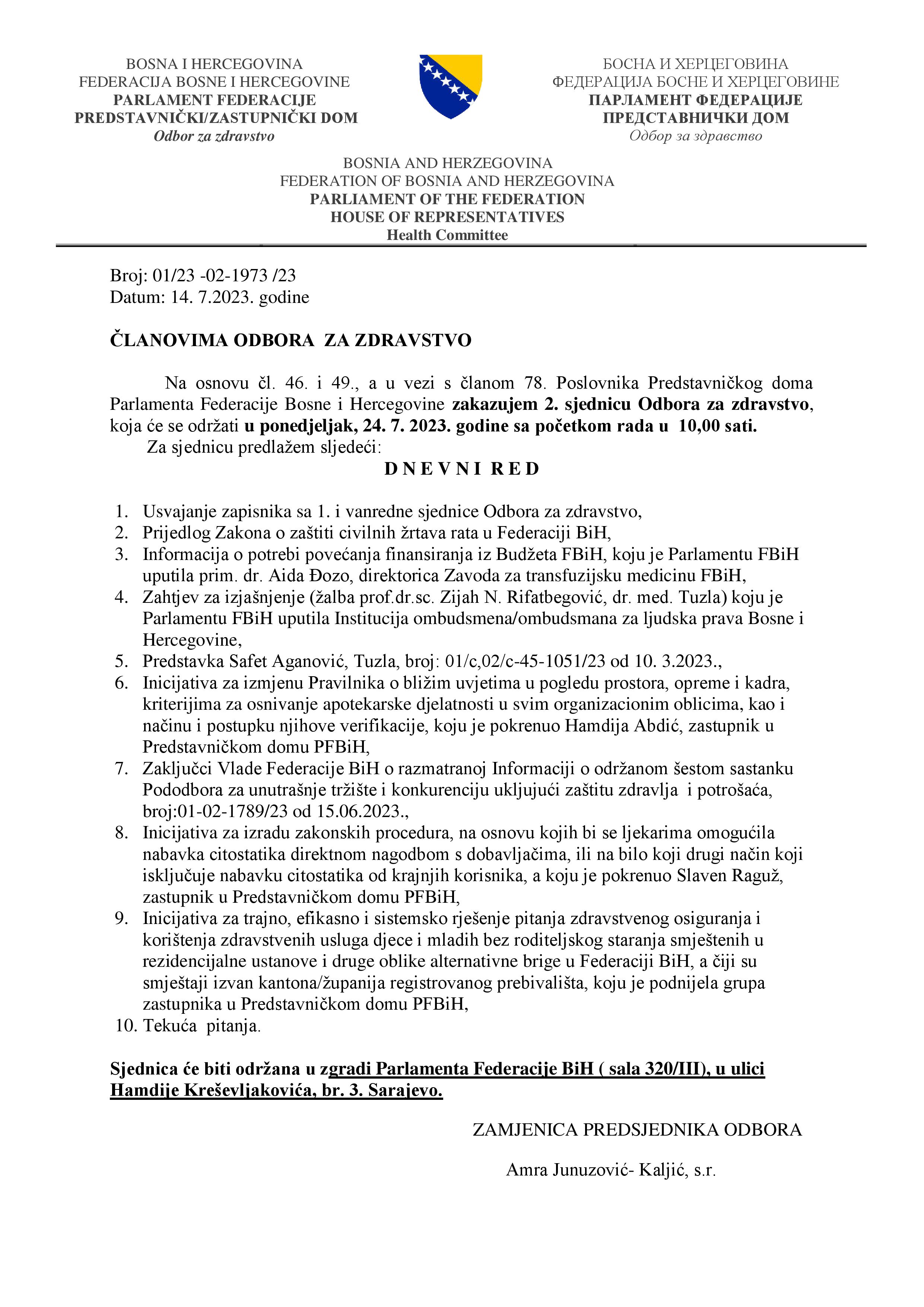 Poziv za 2. sjednicu Odbora za zdravstvo