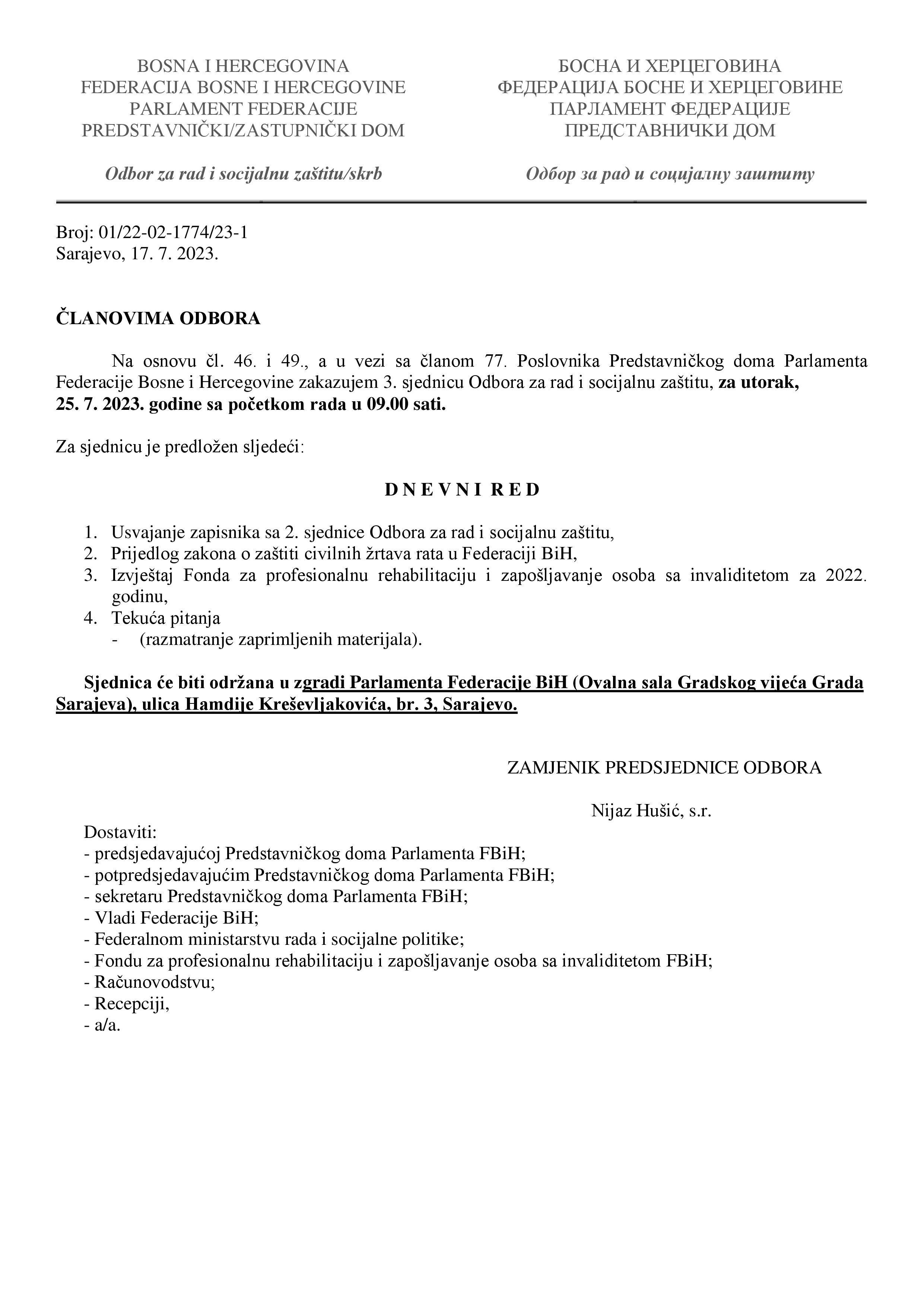 Poziv za 3. sjednicu Odbora za rad i socijanu zaštitu