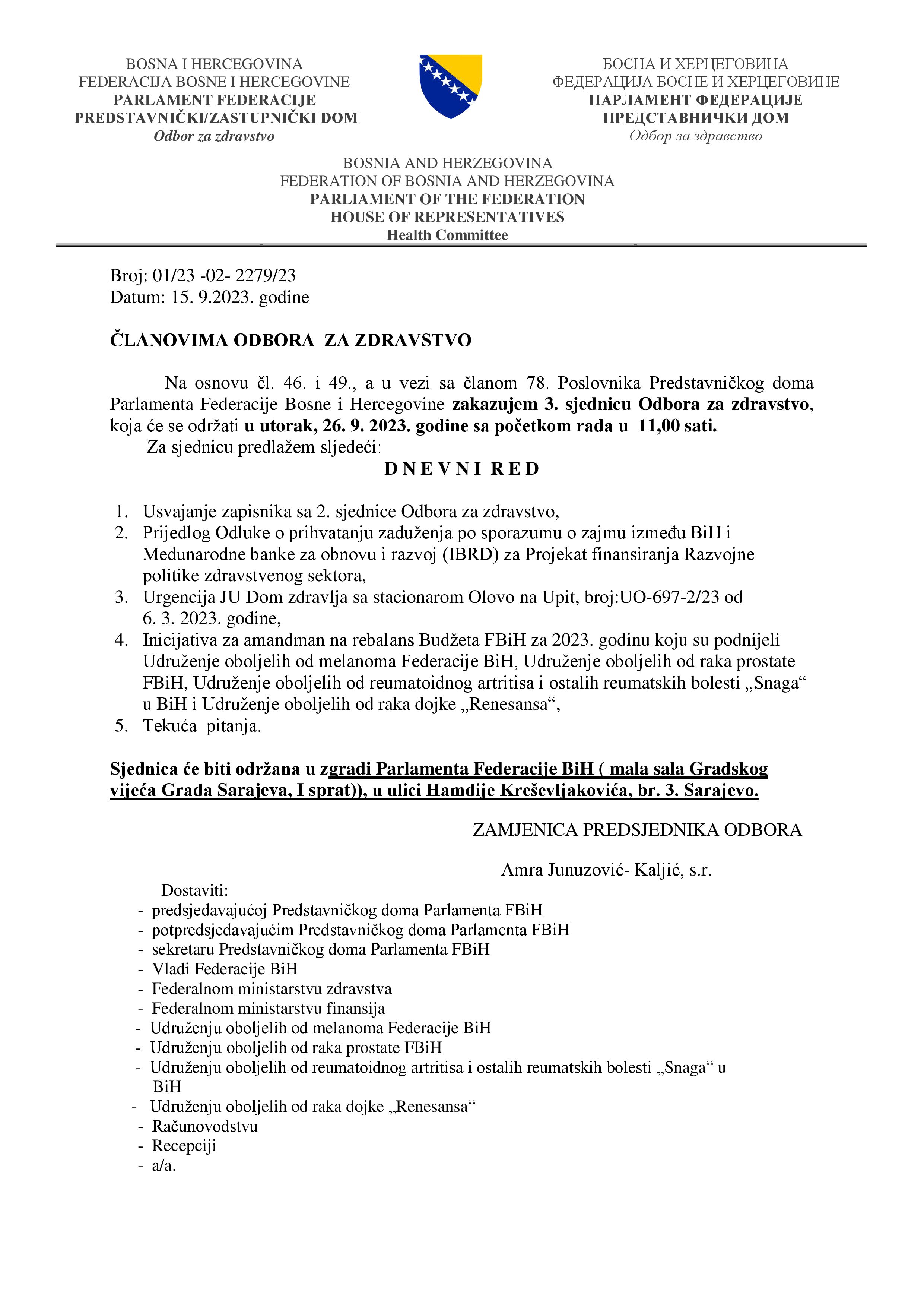 Poziv za 3. sjednicu Odbora za zdravstvo