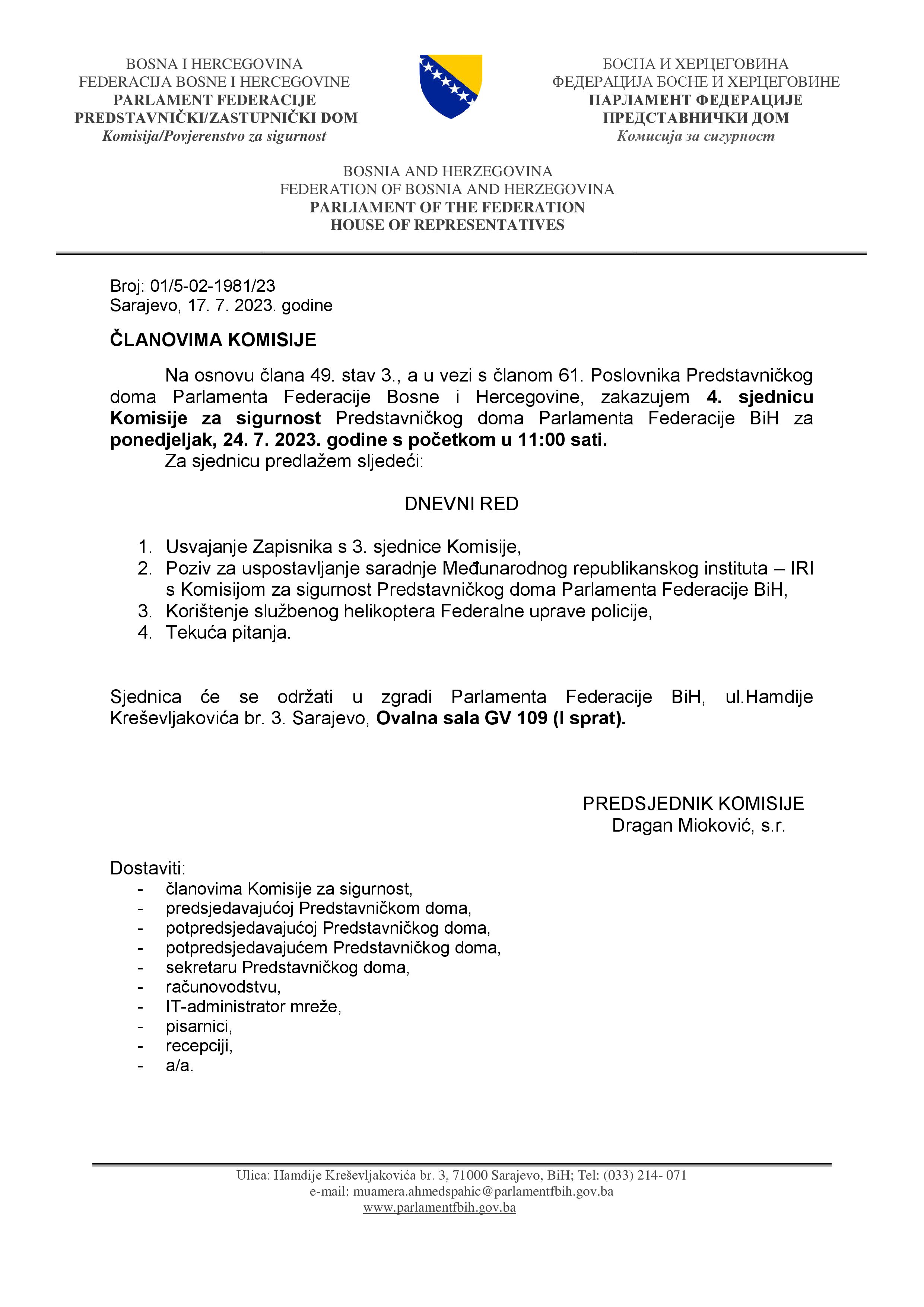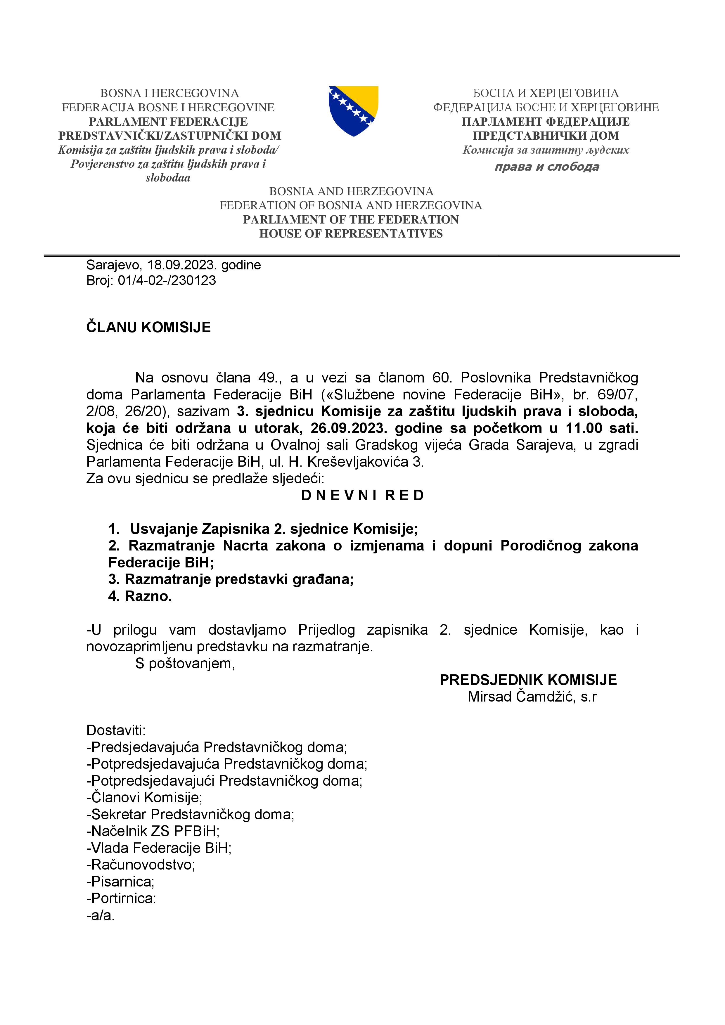 Poziv za 3. sjednicu Komisije za zaštitu ljudskih prava i sloboda