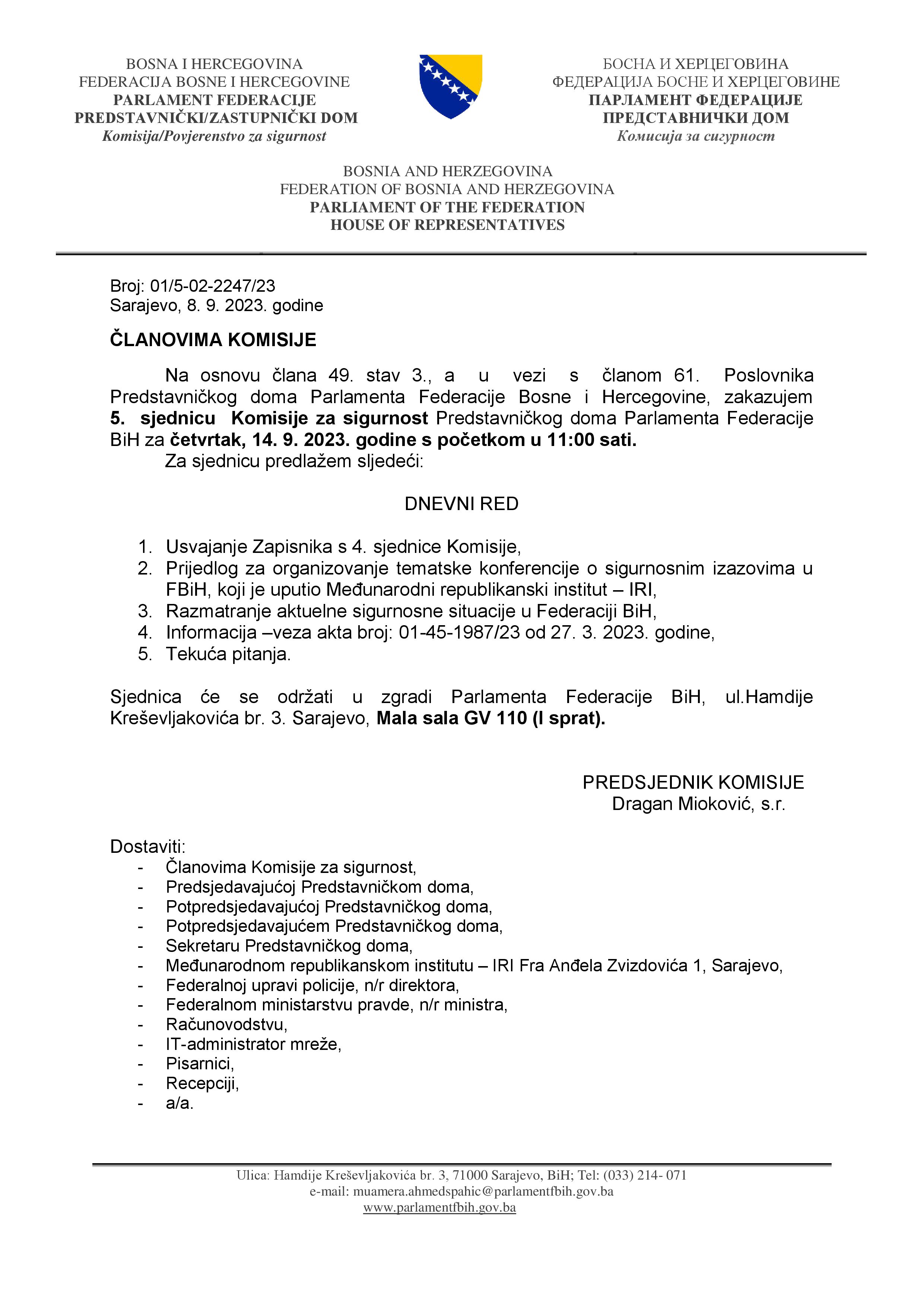 Poziv za 5. sjednicu Komisije za jednakopravnost spolova