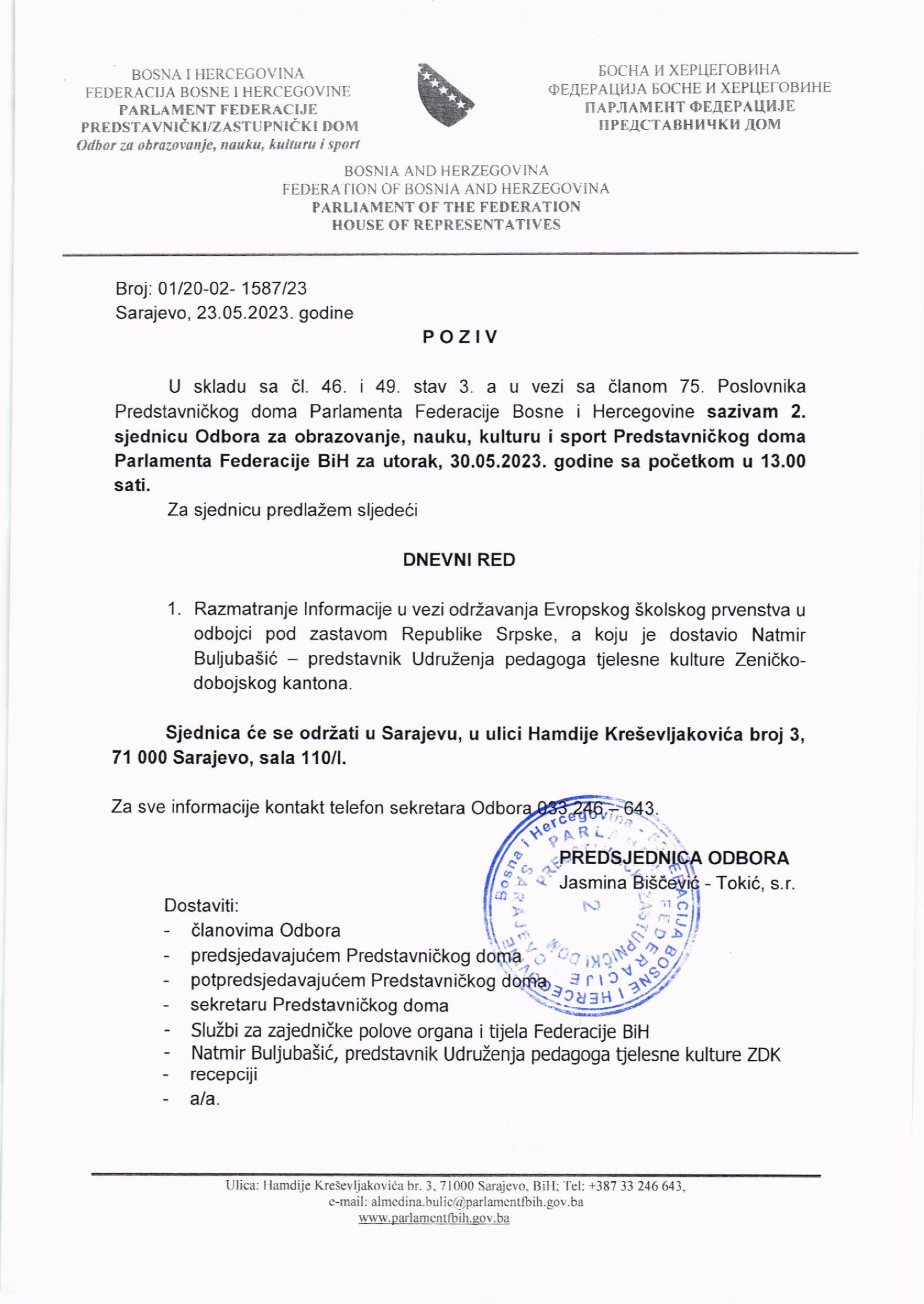 Poziv za 2. sjednicu Odbora za obrazovanje, nauku, kulturu i sport