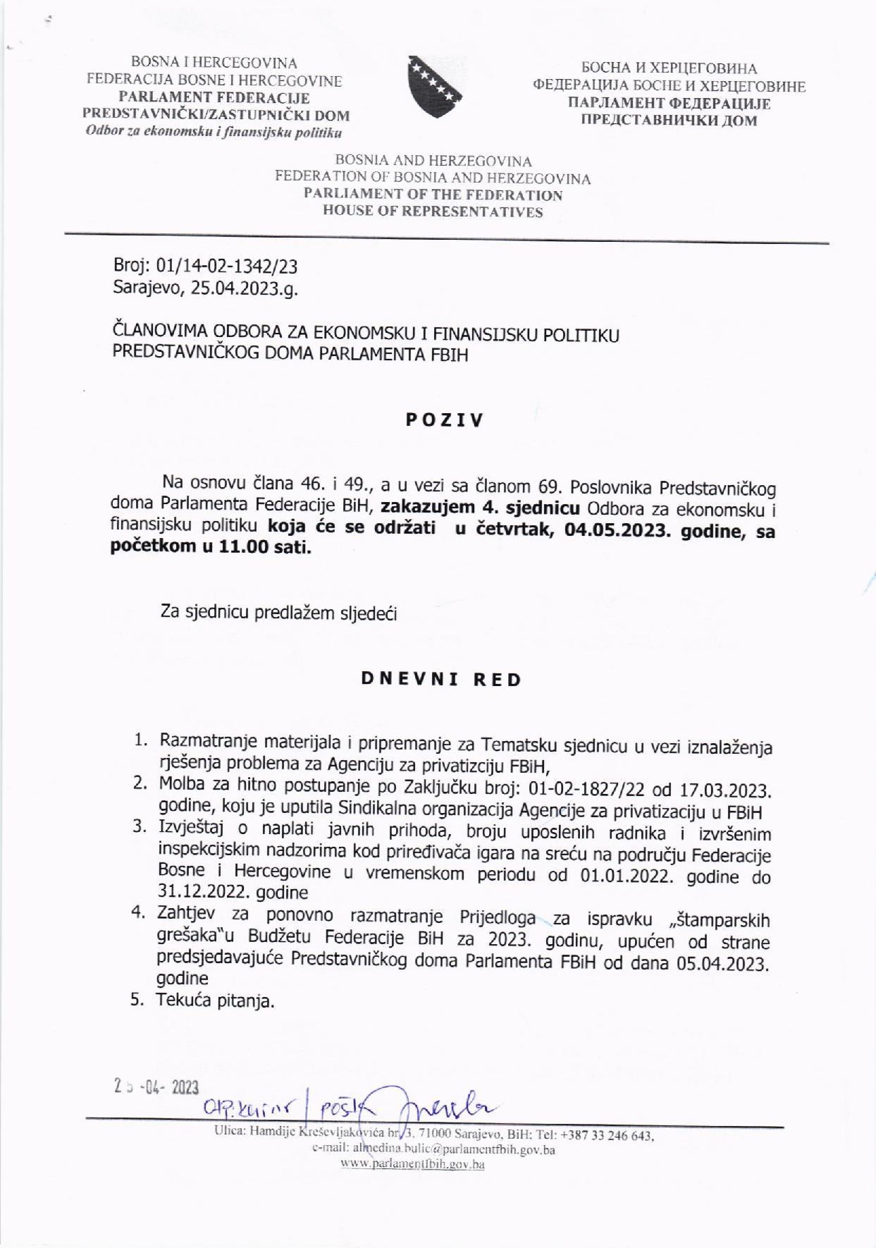 POZIV ZA 4. SJEDNICU ODBORA ZA EKONOMSKU I FINANSIJSKU POLITIKU