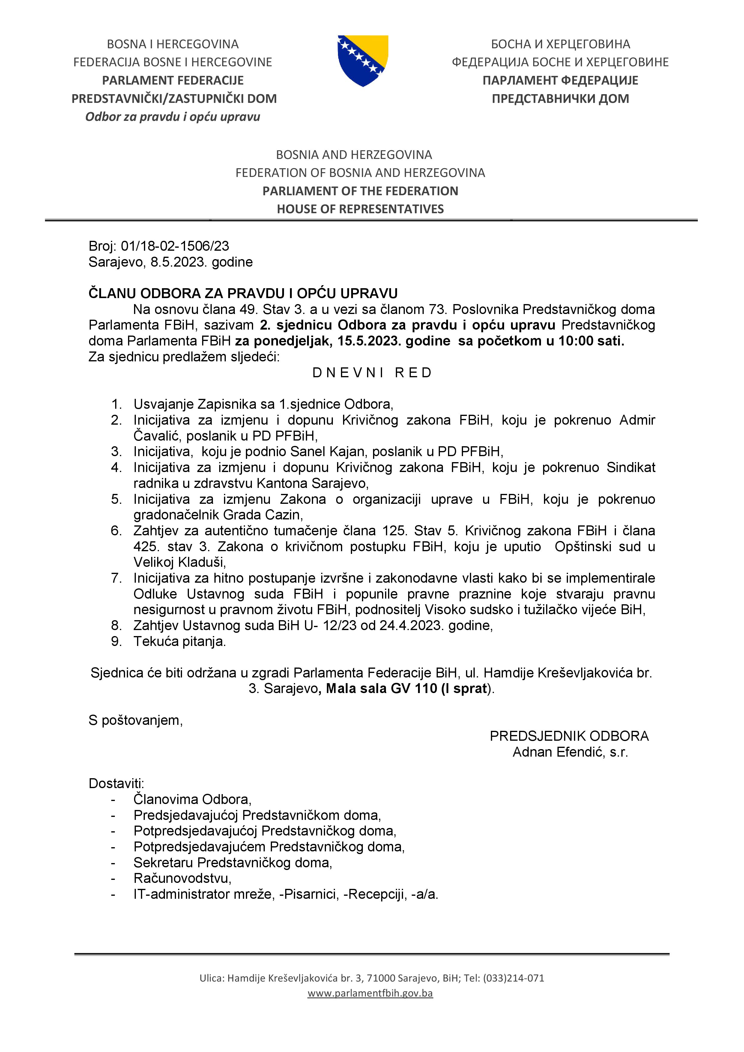 Poziv za 2. sjednicu Odbora za pravdu i opštu upravu