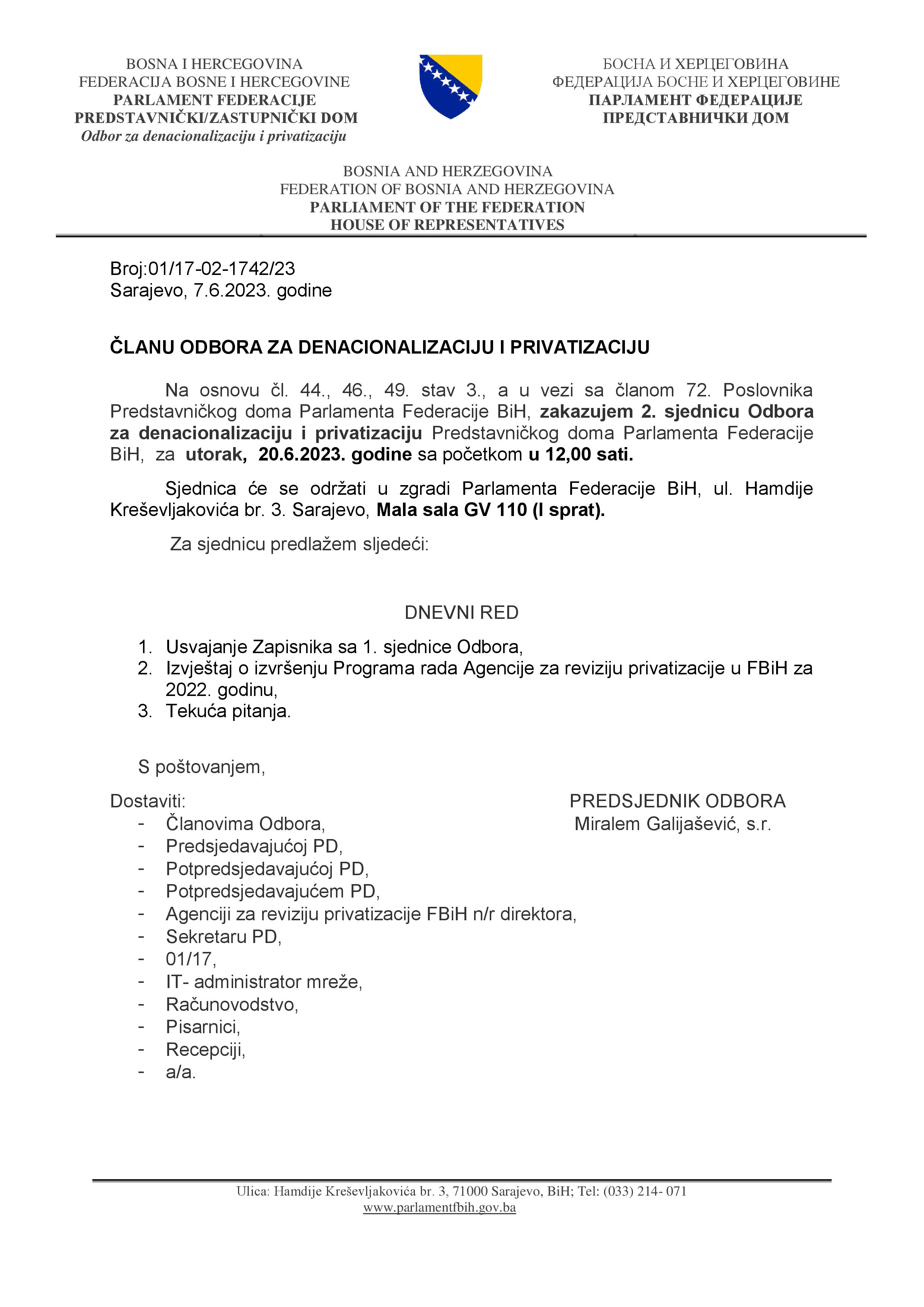 Poziv za 2. sjednicu Odbora za denacionalizaciju i privatizaciju