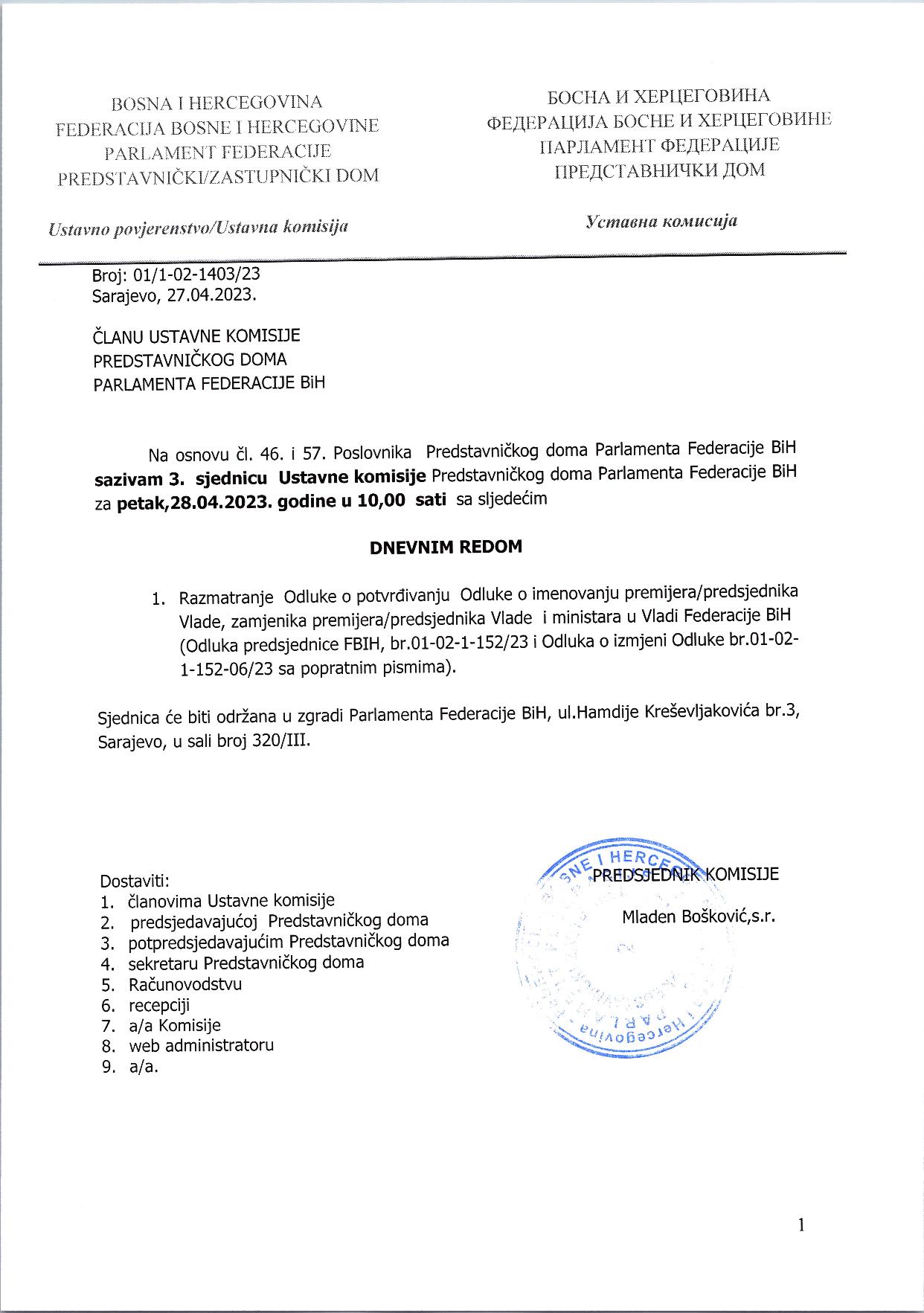 Poziv za 3. sjednicu Ustavne komisije