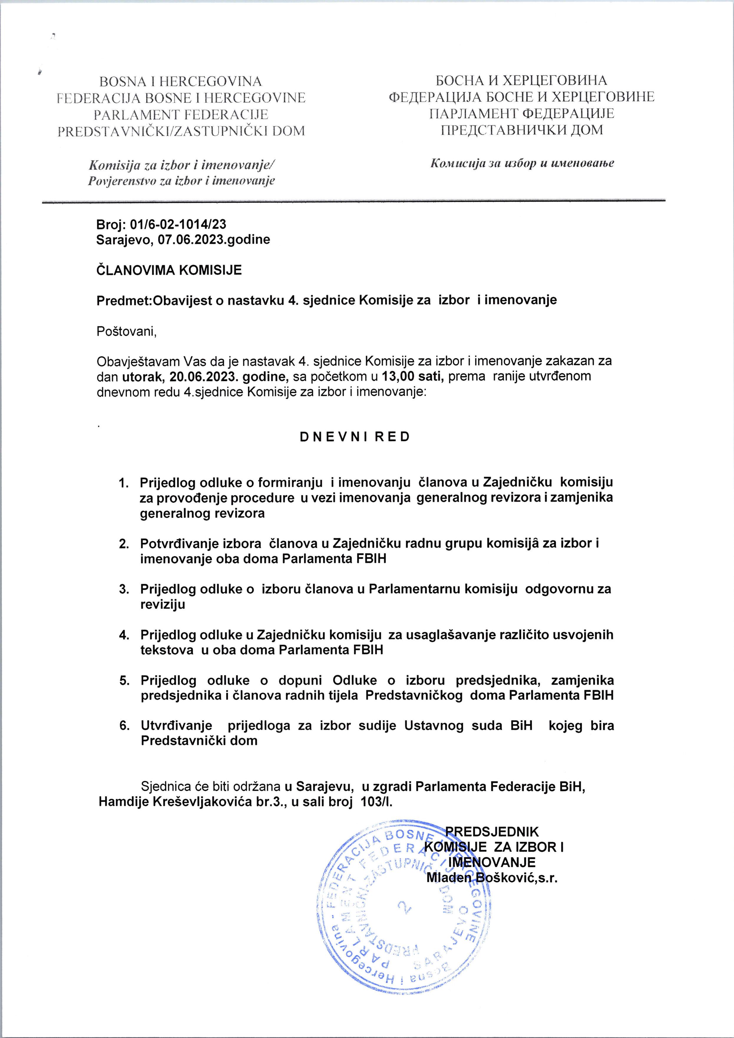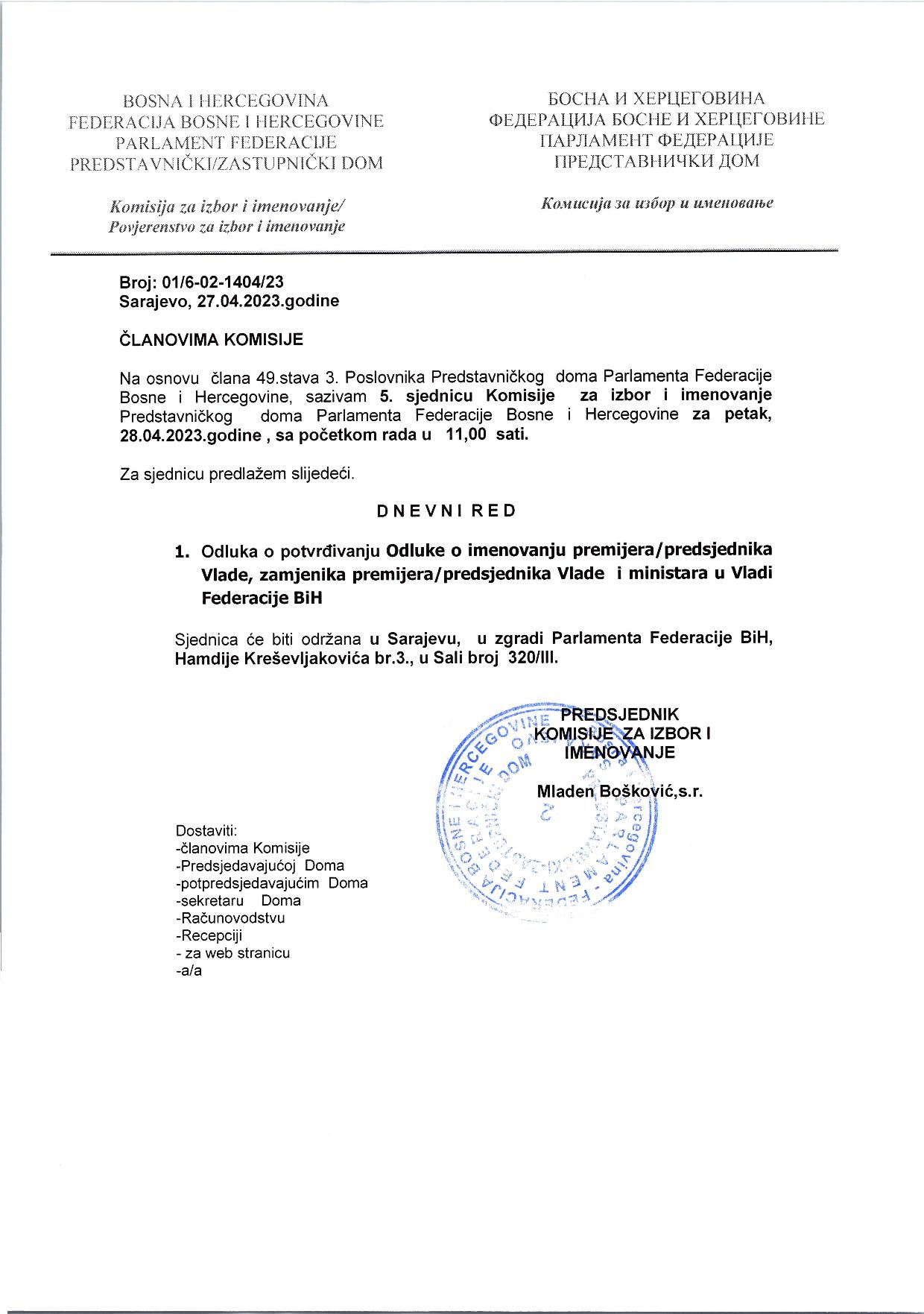 Poziv za 5. sjednicu Komisije za izbor i imenovanje