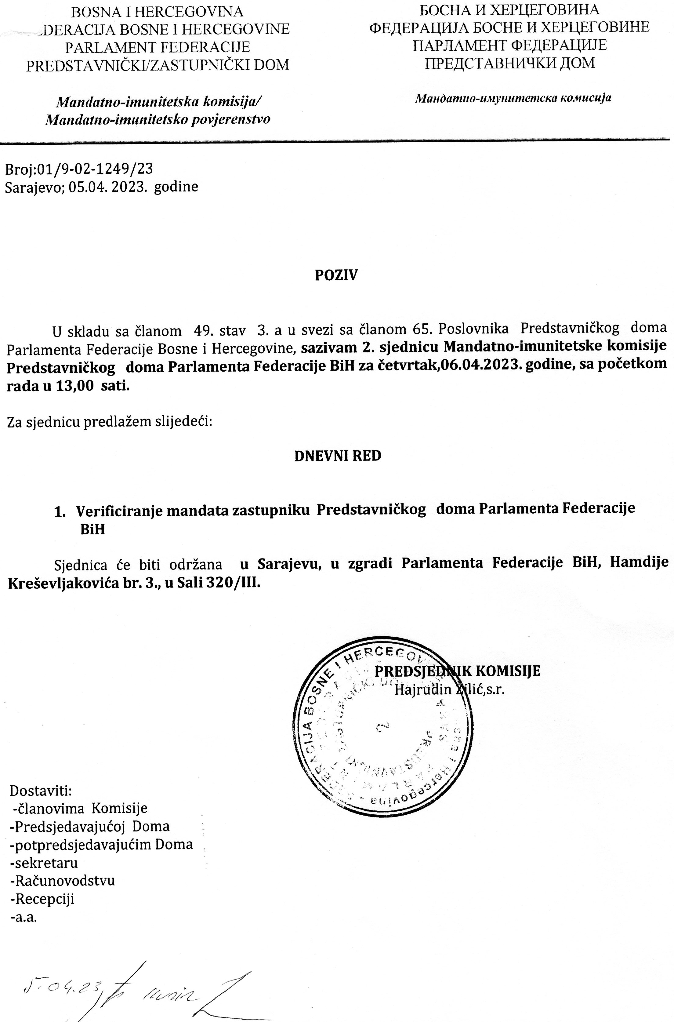 Poziv za 2. sjednicu Mandatno-imunitetske komisije