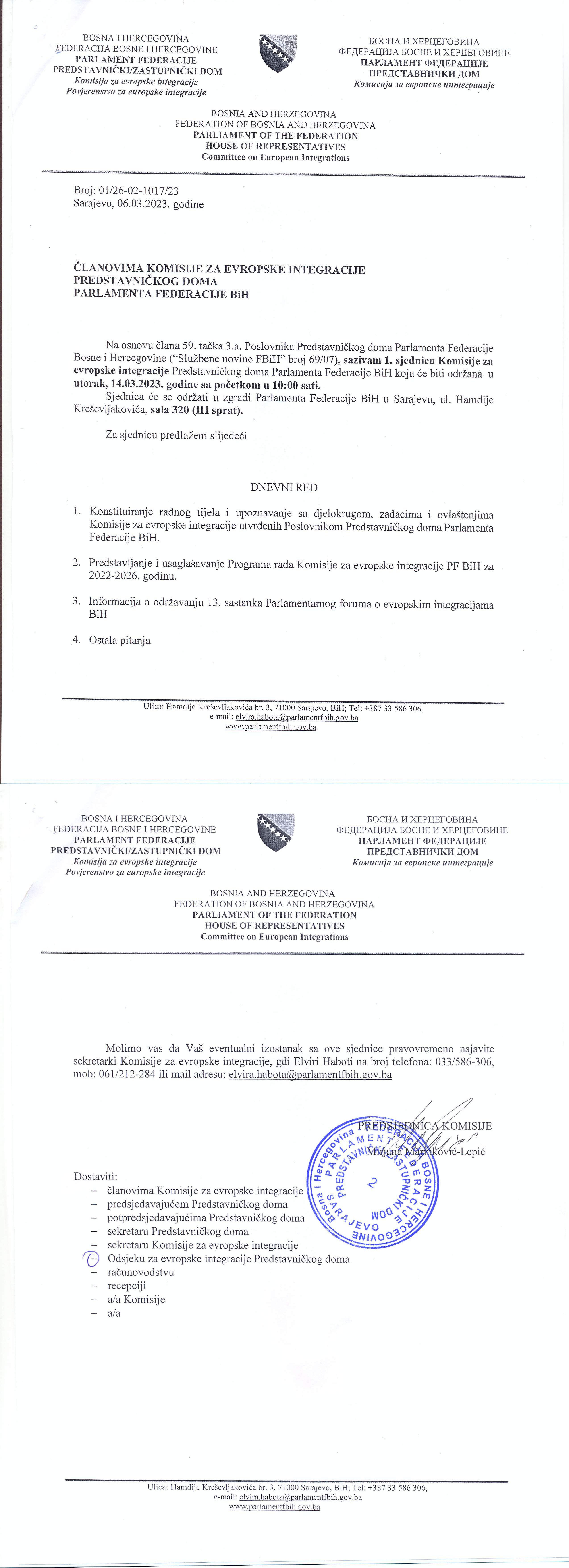 Poziv za 1. sjednicu Komisije za evropske integracije
