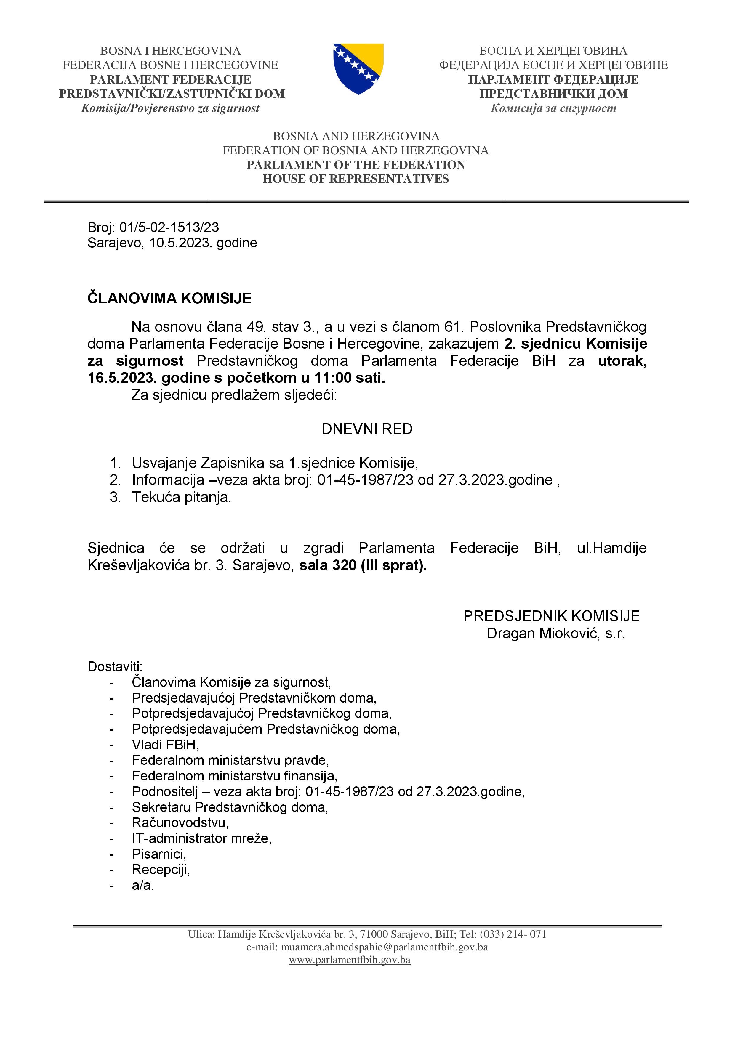 Poziv za 2. sjednicu Komisije za sigurnost