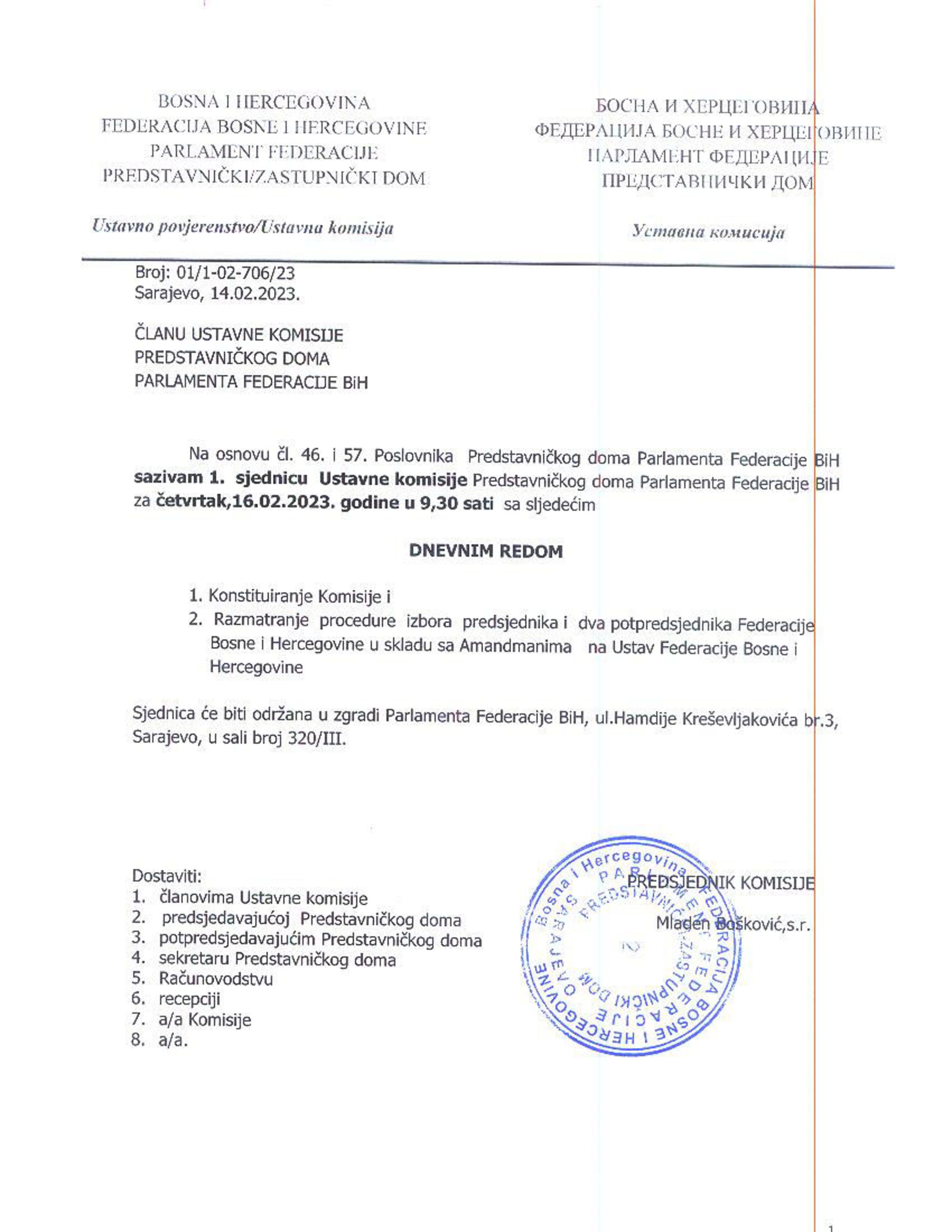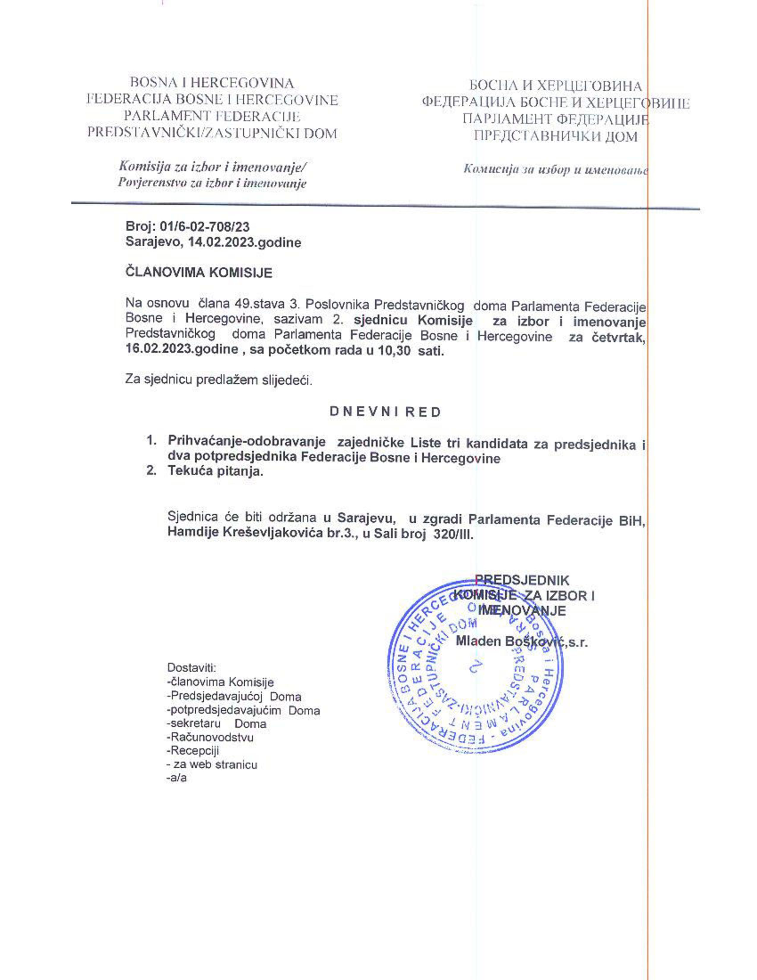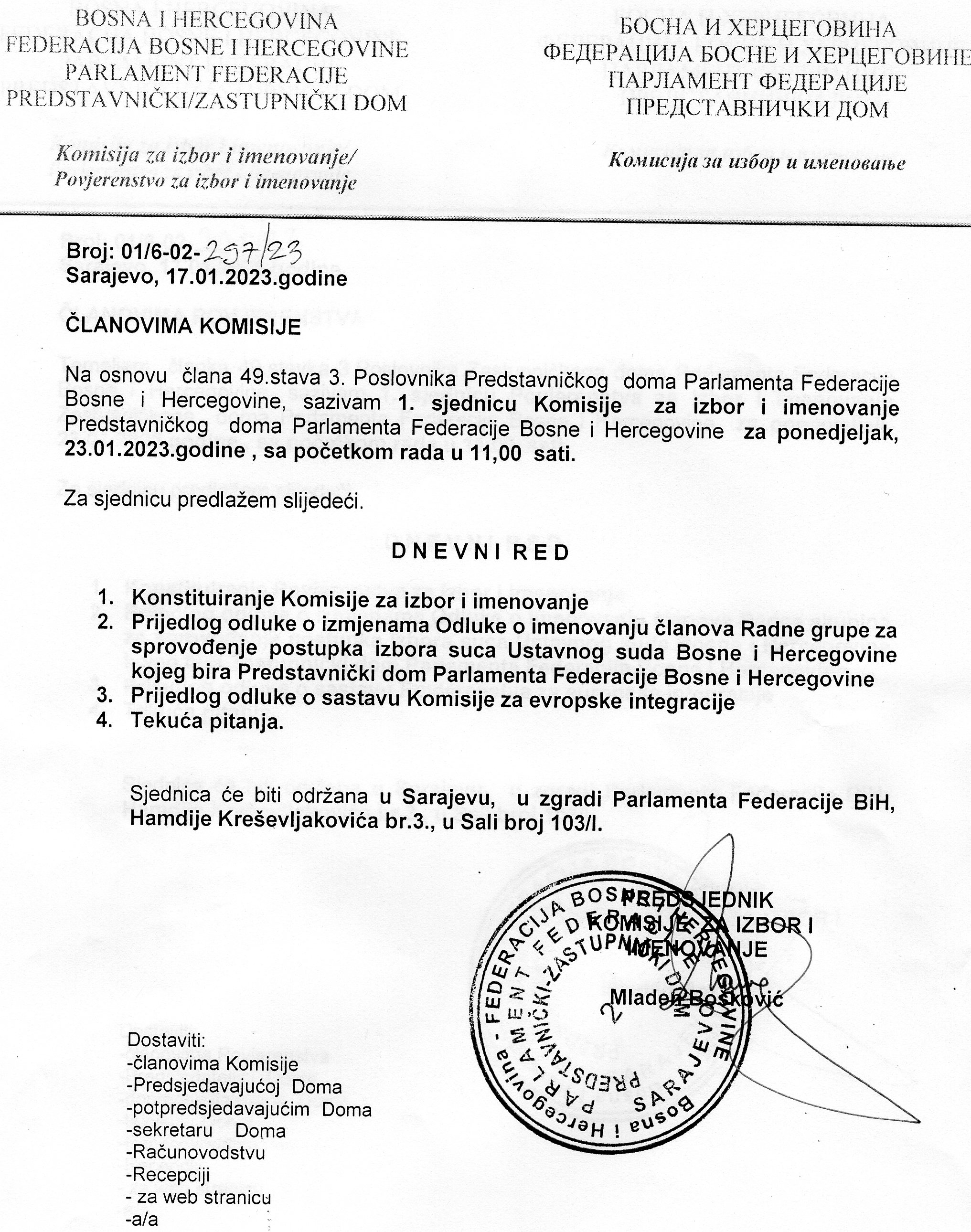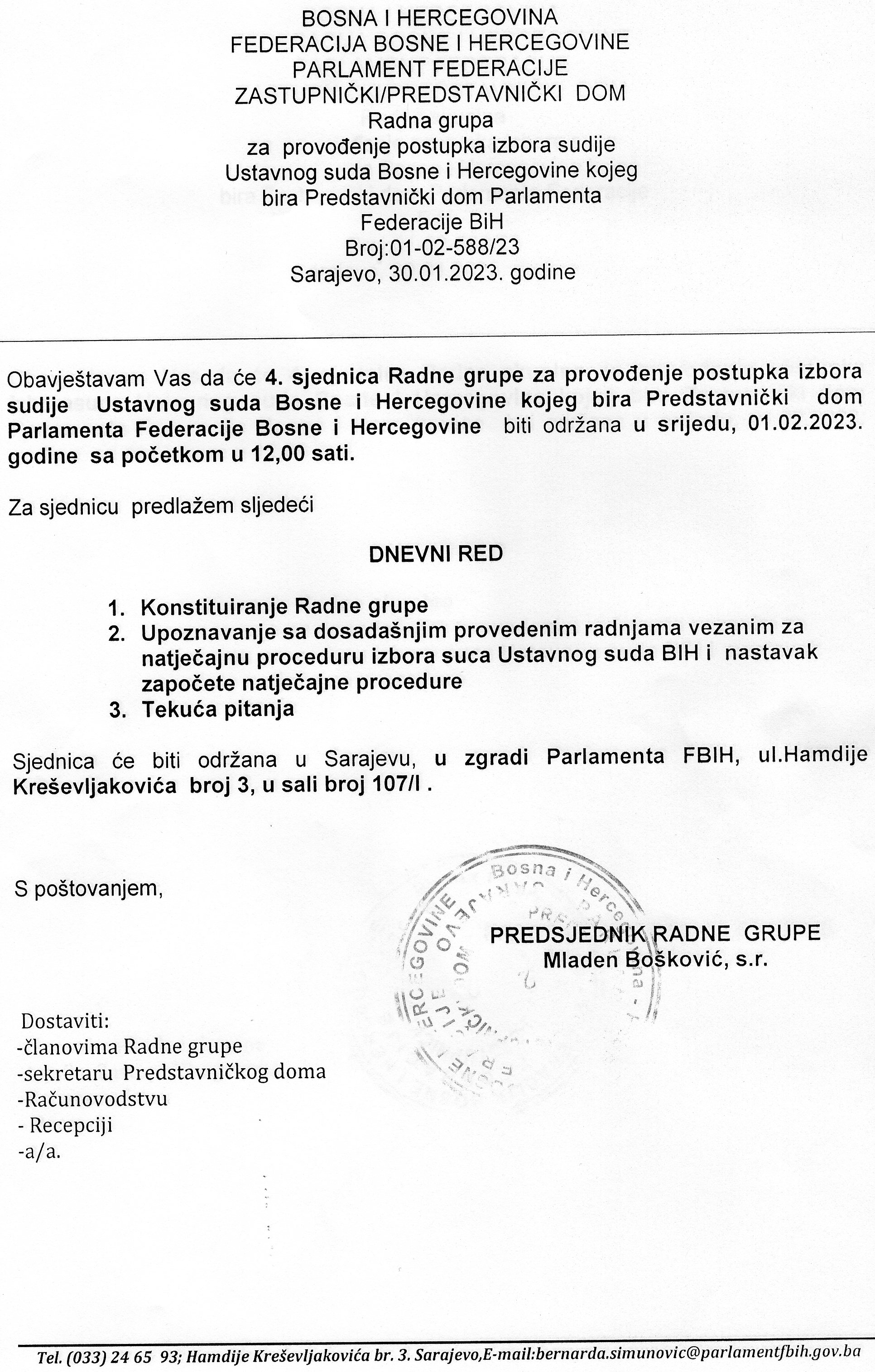 Poziv za 4. sjednicu Radne grupe za provođenje postupka izbora sudije Ustavnog suda BIH 01.02.2023 Najave Pročitaj više