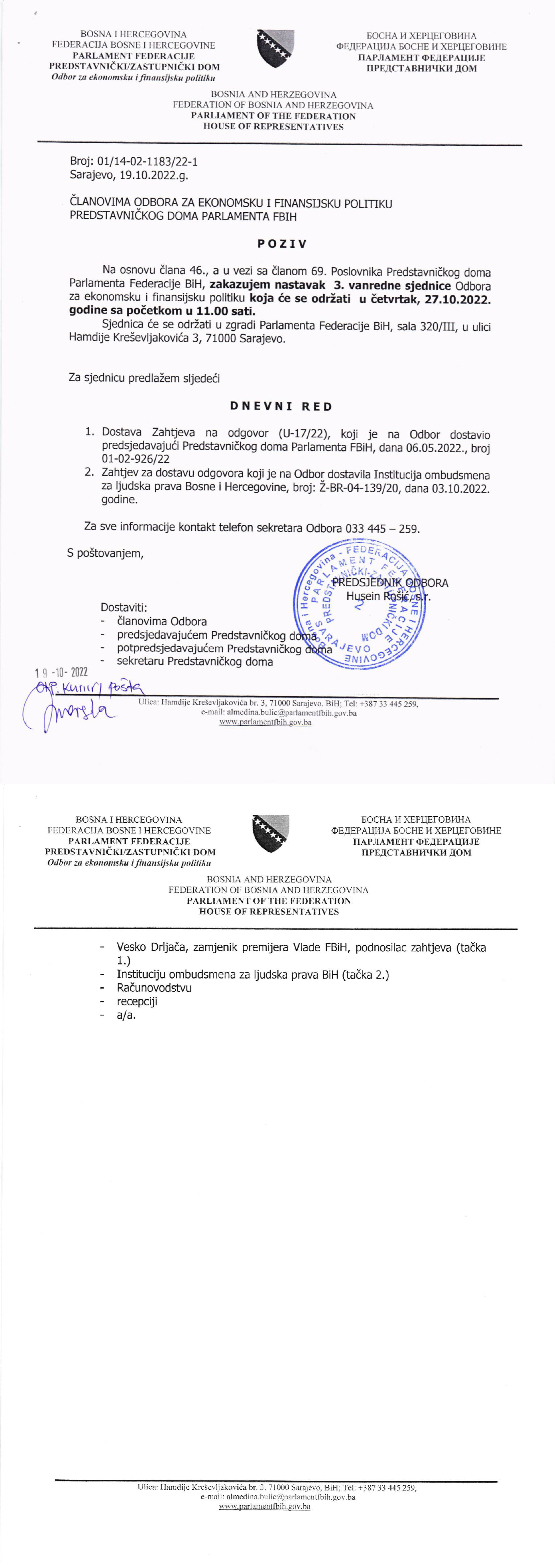Poziv za nastavak 3. vanredne sjednice Odbora za ekonomsku i finansijsku politiku 19.10.2022 Najave Pročitaj više