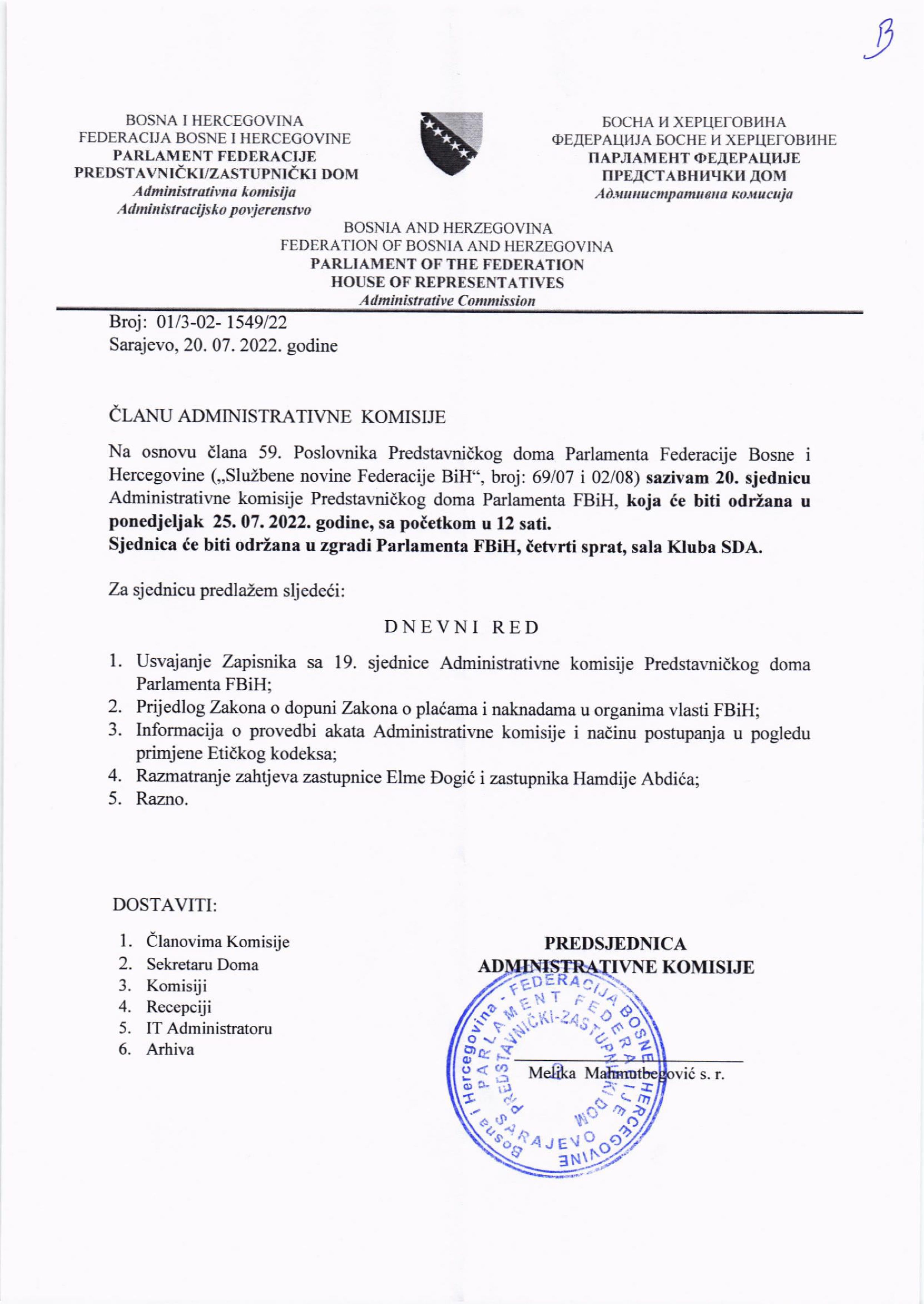 Poziv za 20.sjednicu Odbora za pravdu i opštu upravu