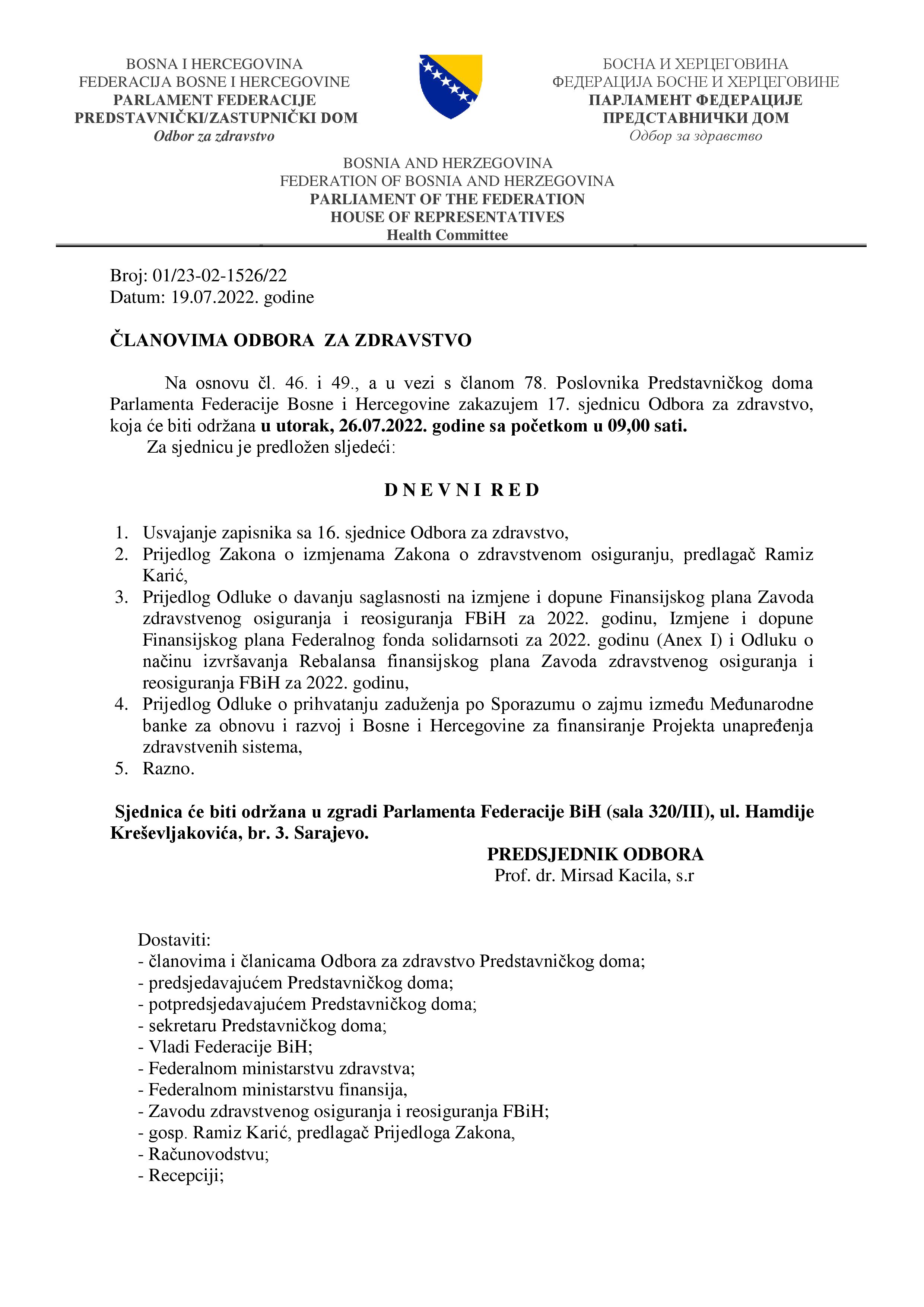 Poziv za 17. sjednicu Odbora za zdravstvo