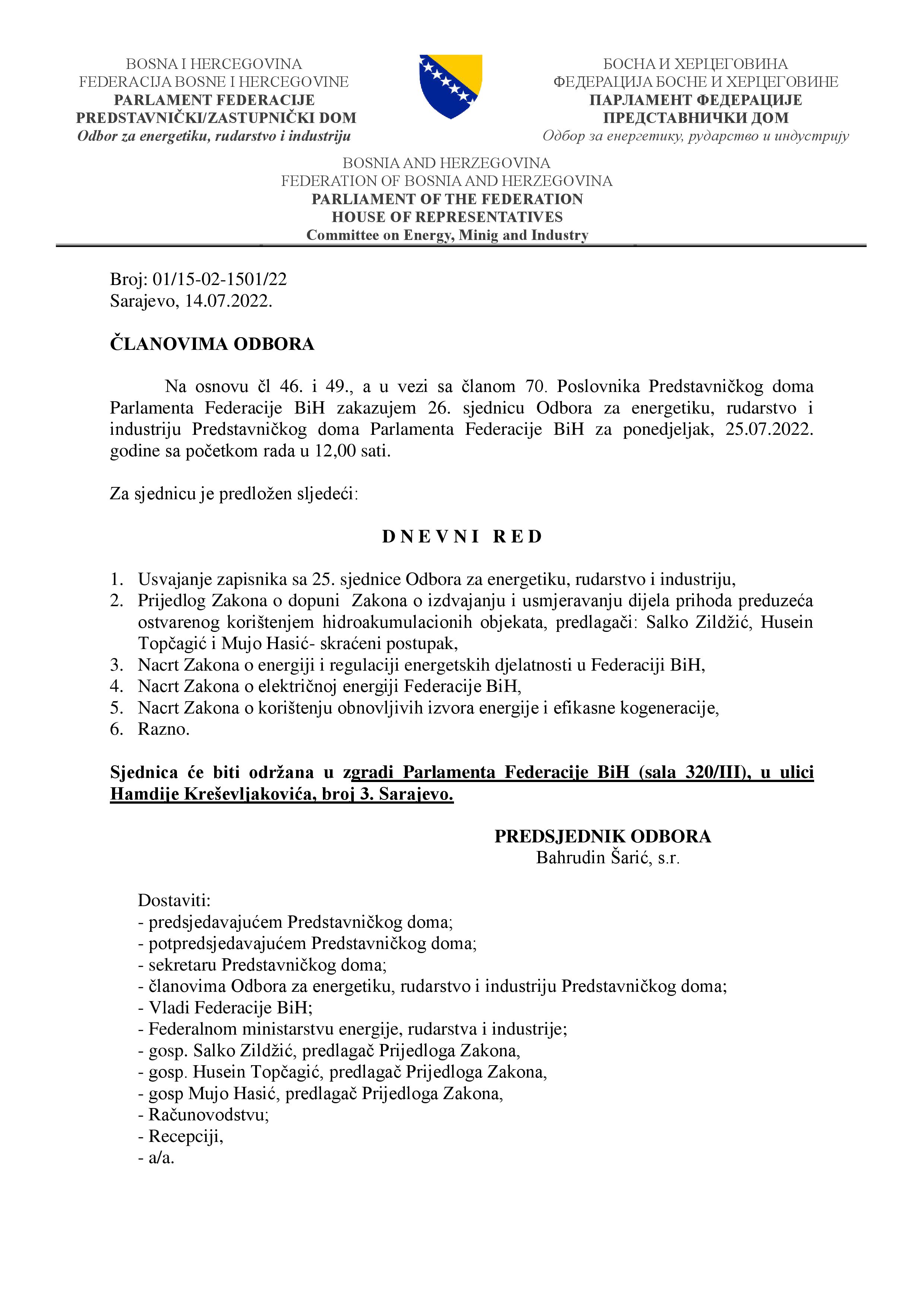 Poziv za 26. sjednicu Odbora za energetiku, rudarstvo i industriju