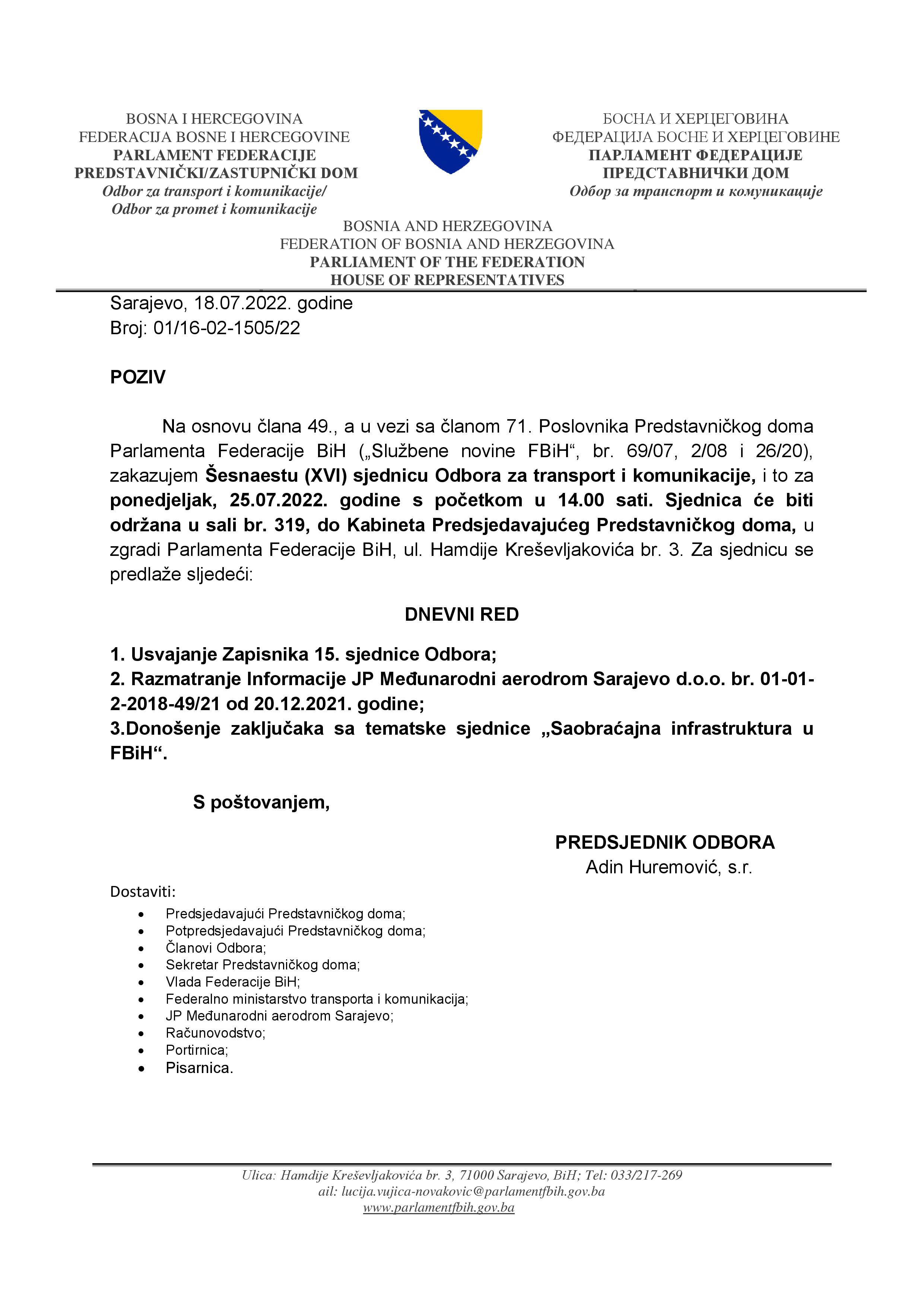 Poziv za 16. sjednicu Odbora za promet i komunikacije