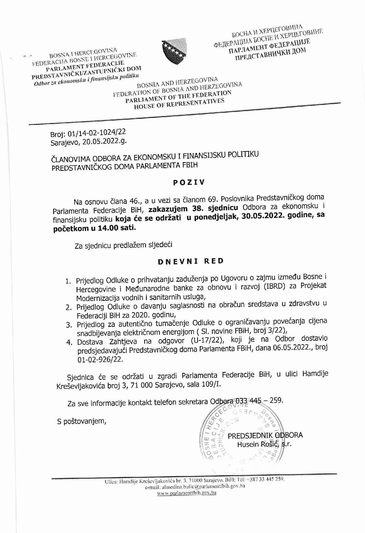 Poziv za 38. sjednicu Odbora za ekonomsku i finansijsku politiku