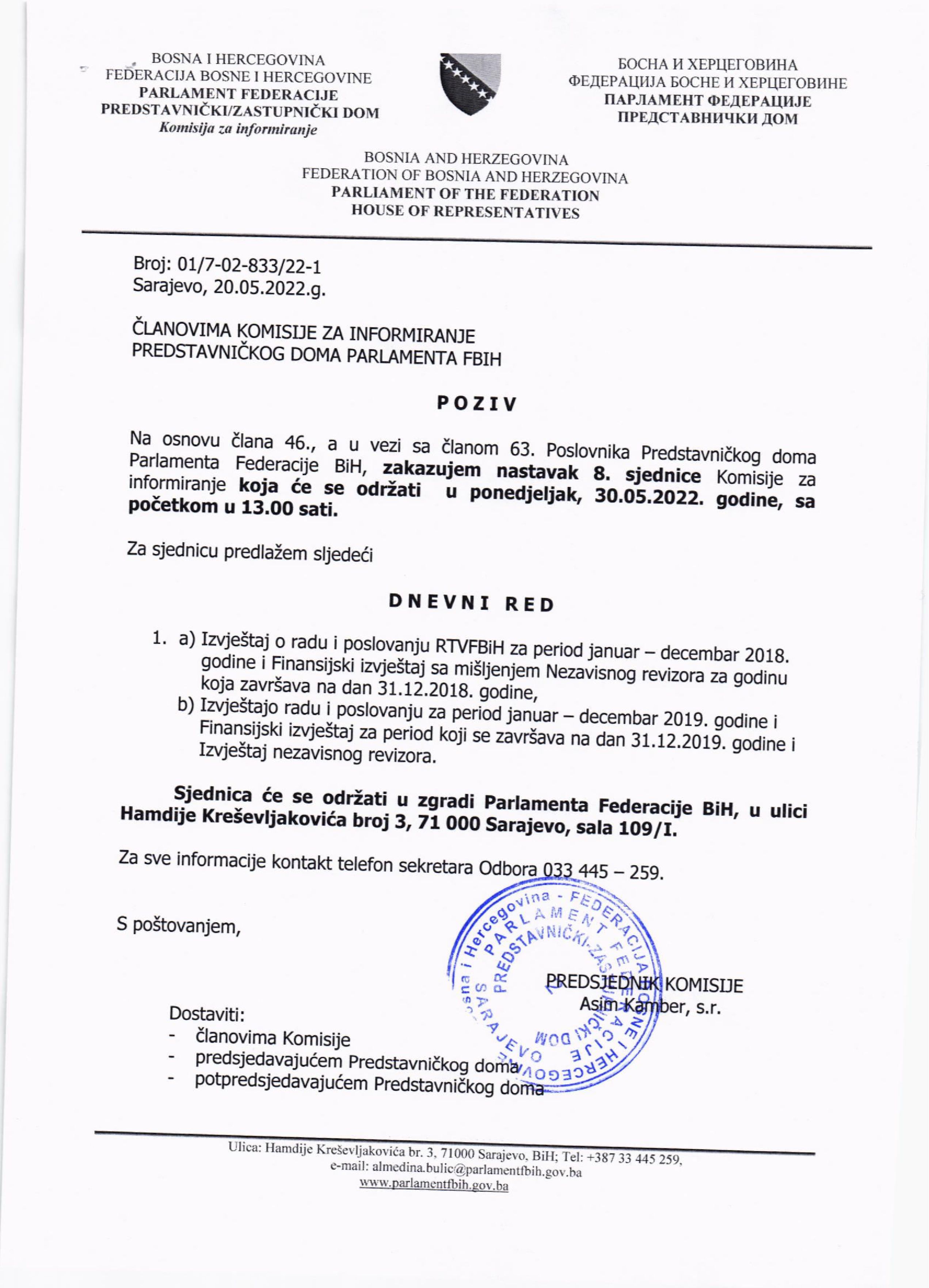 Poziv za nastavak 8. sjednice Komisije za informisanje