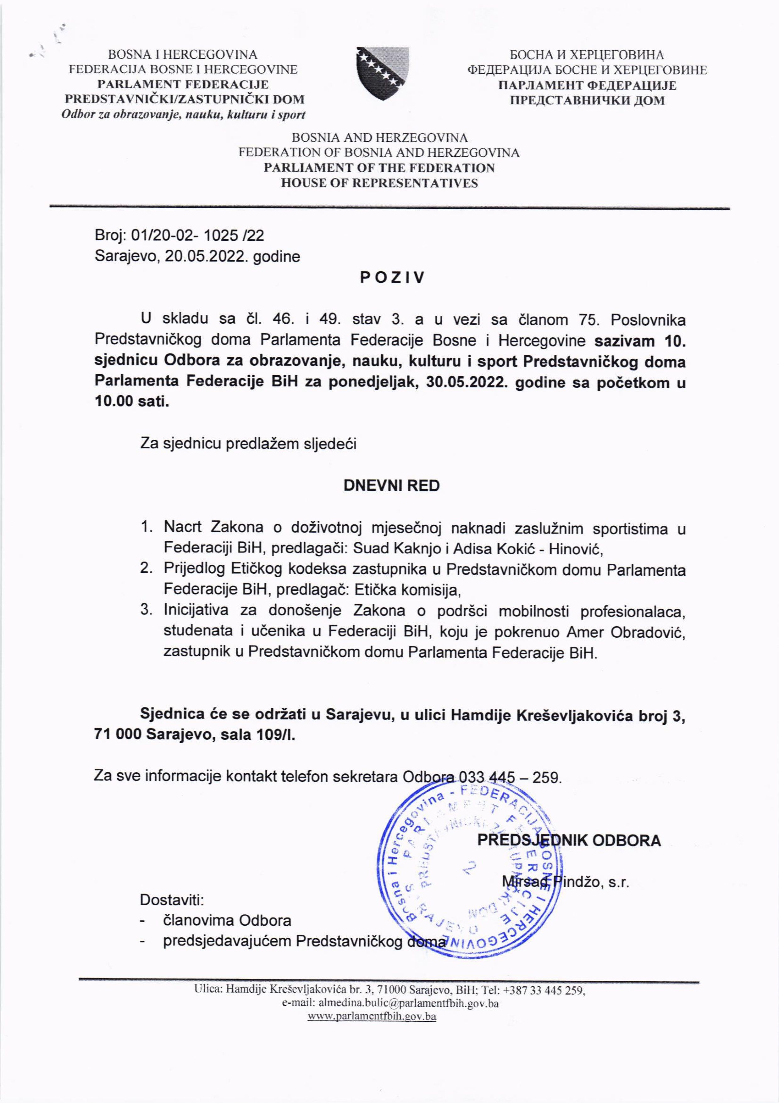 Poziv za 10. sjednicu Odbora za obrazovanje, nauku kulturu i sport