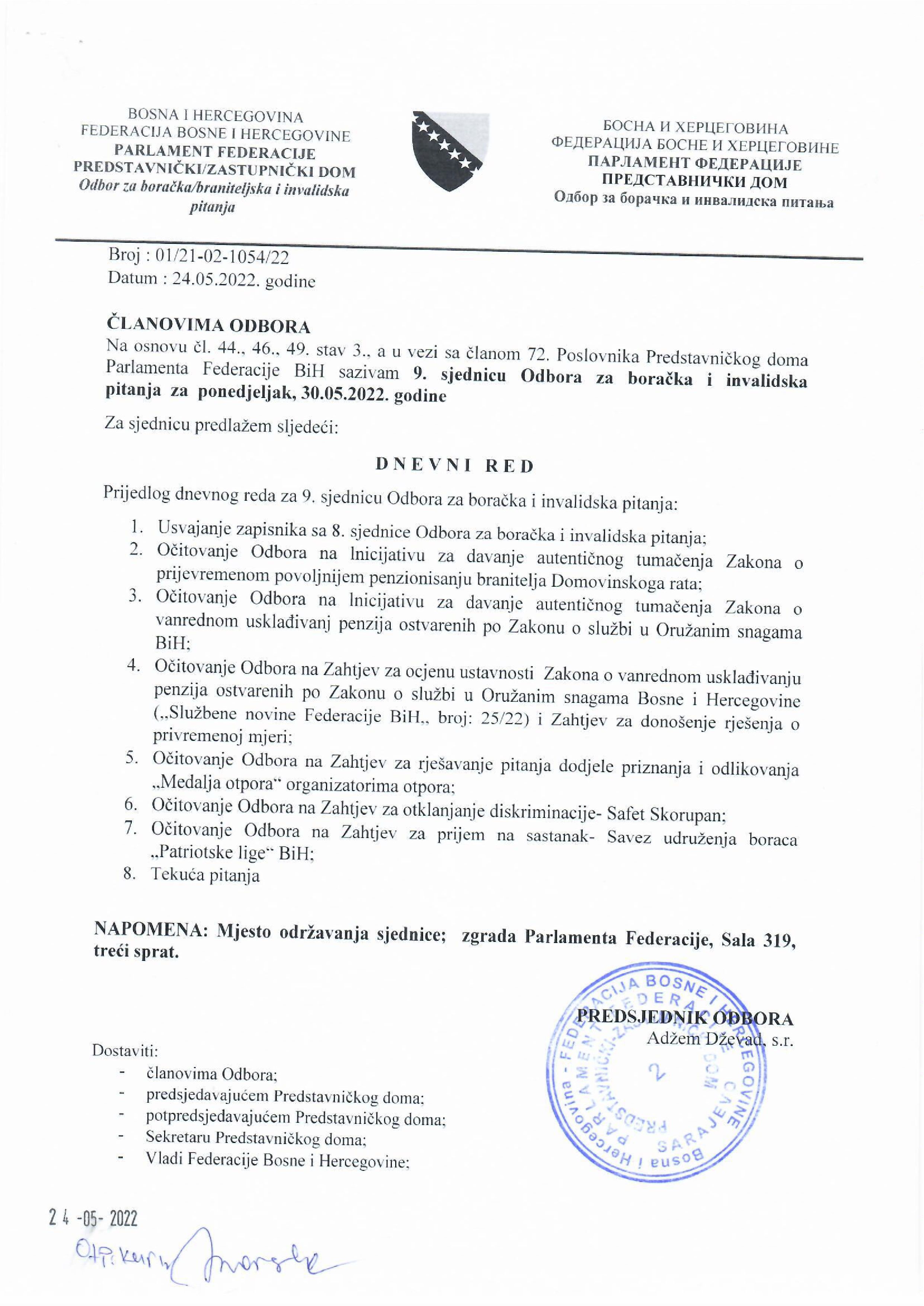 Poziv za 9. sjednicu Odbora za boračka i invalidska pitanja